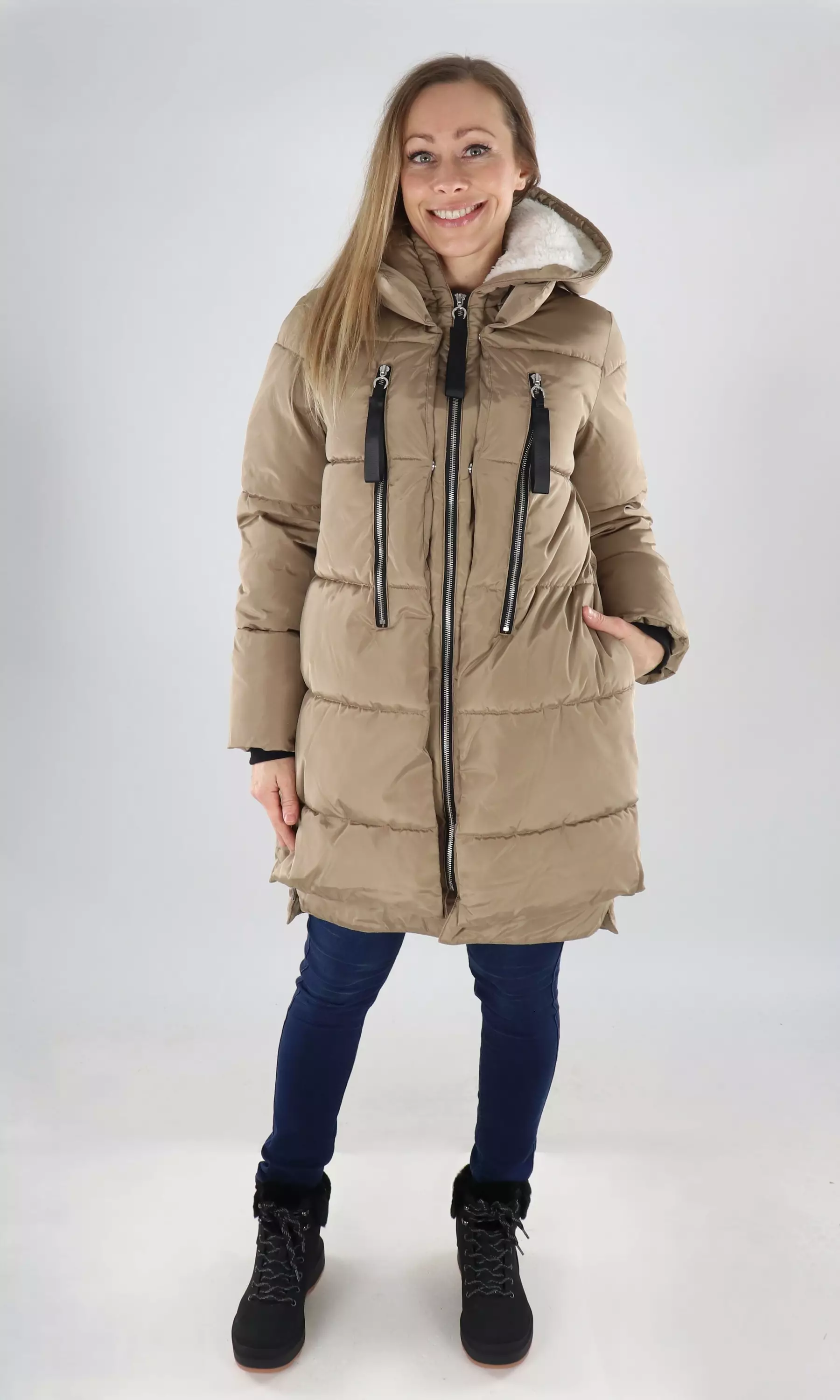 Onlyn beige toppatakki yhdistää käytännöllisyyden ja tyylikkyyden. Takissa on näyttävät vetoketjut, jotka antavat modernin ilmeen, ja hupussa lämmin teddyvuori tuo mukavuutta kylmiin päiviin.
