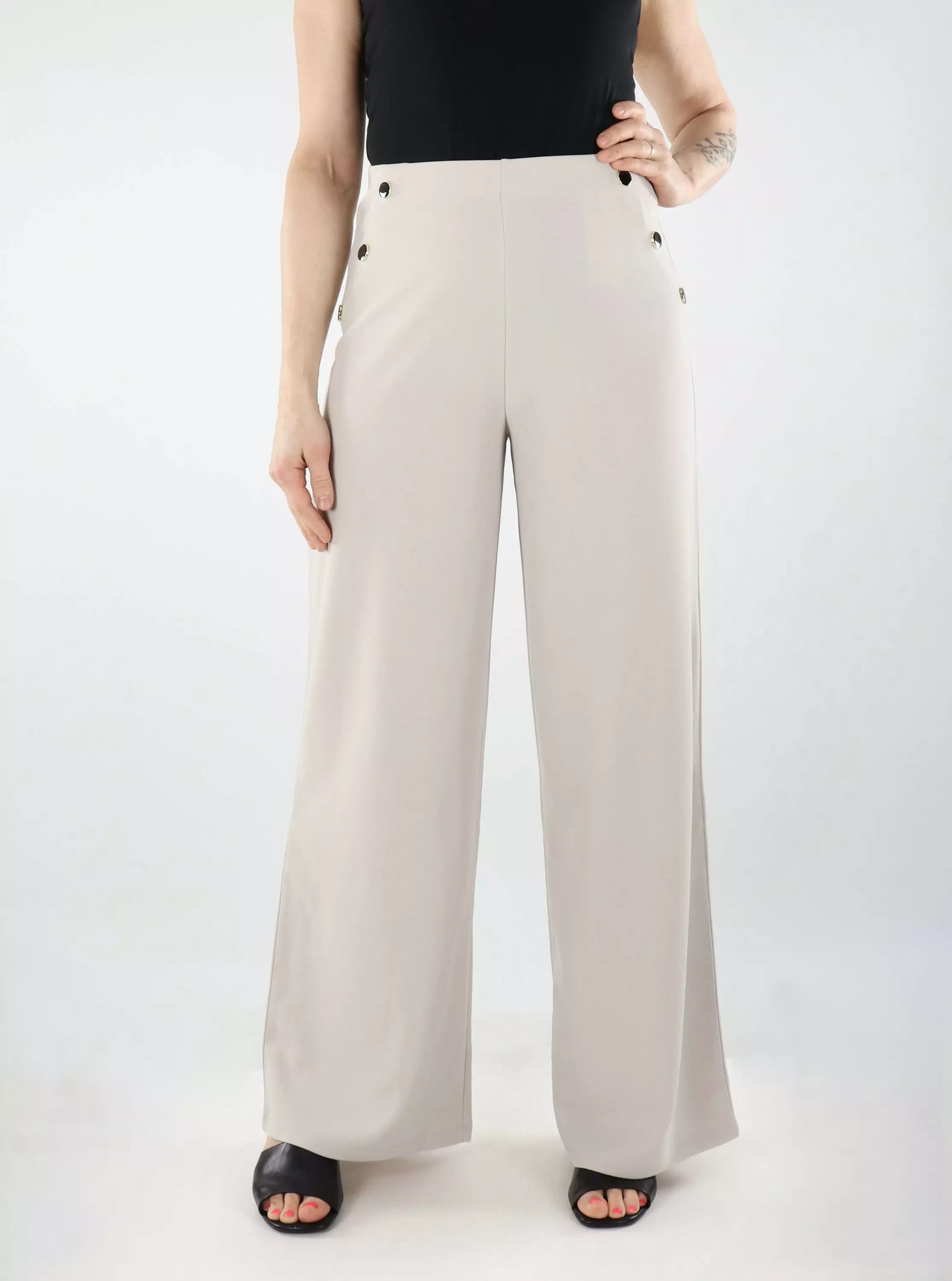 Trendikkäät leveälahkeiset housut upeilla nappiyksityiskohdilla. Joustavan vyötärökaistaleen myötä housut istuvat päälle täydellisesti!