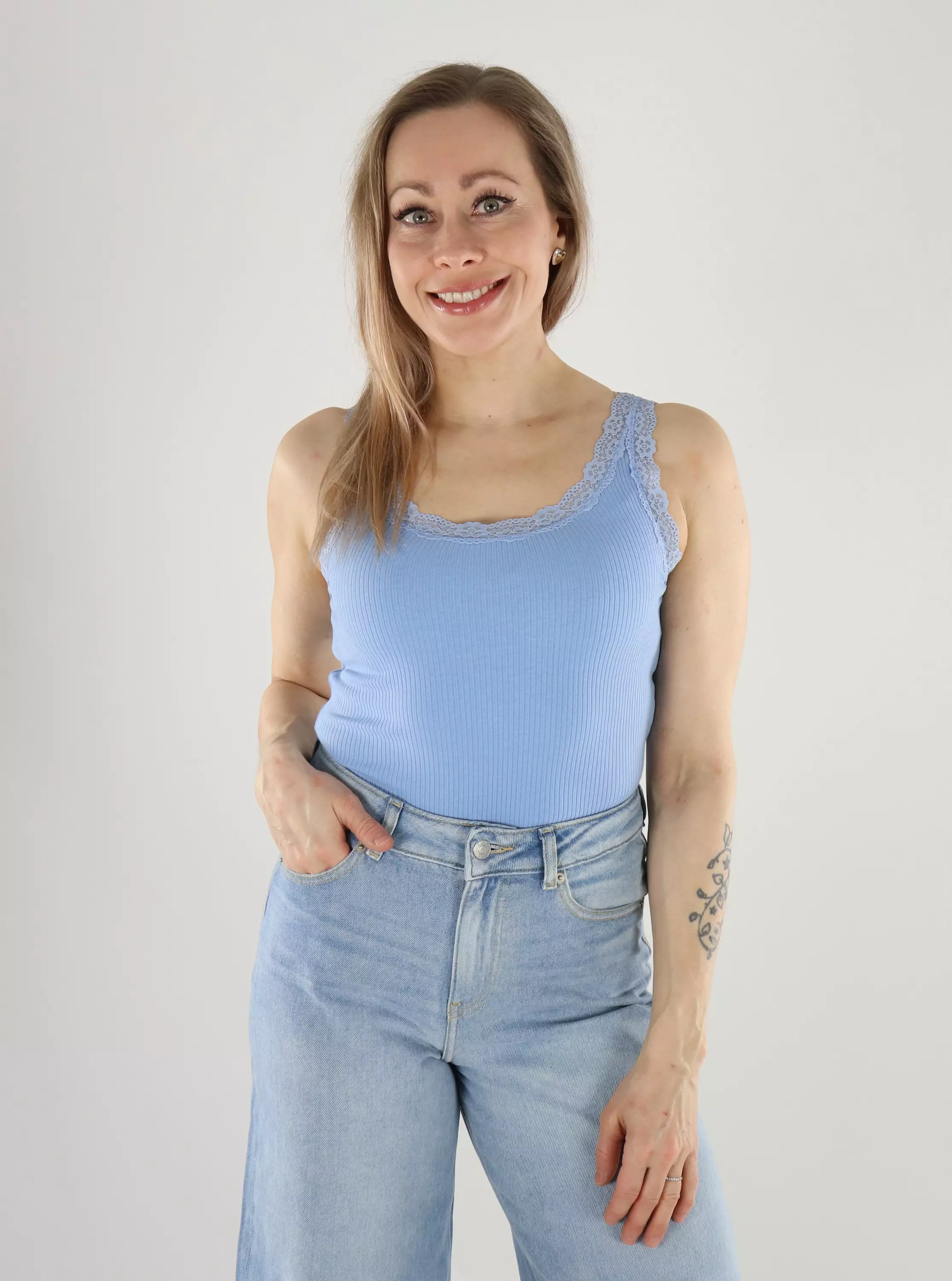 Tyylikäs ja monikäyttöinen ribbikankainen toppi, jossa kaunis pitsireunainen pääntie tuo ripauksen naisellisuutta. Miellyttävä, joustava materiaali istuu hyvin ja tuntuu mukavalta päällä koko päivän. Helppo yhdistää niin farkkuihin kuin hameisiin!
