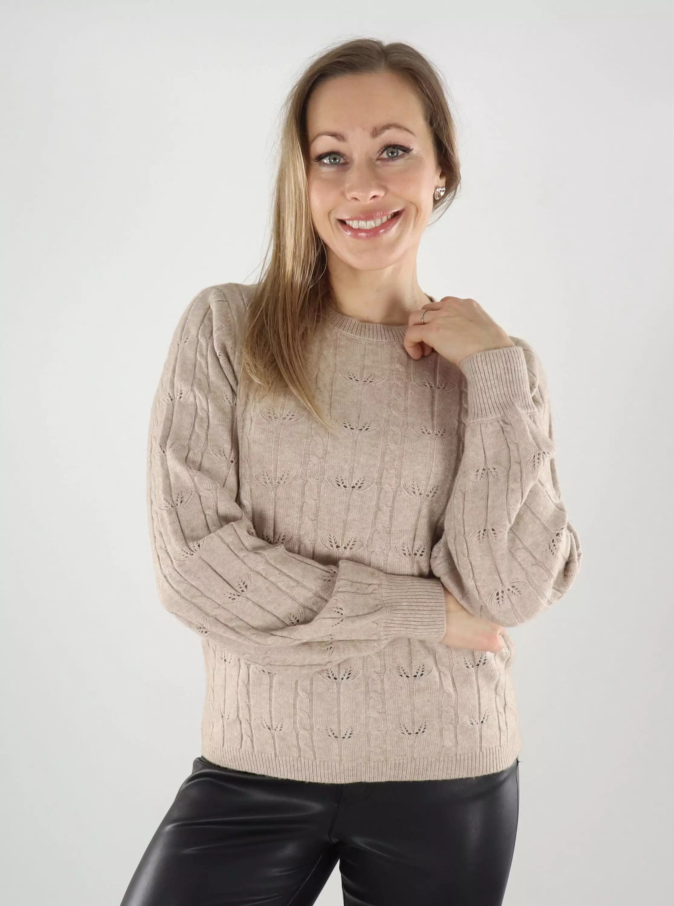Tämä pehmeä palmikkokuvioinen neule on ajaton luottovaate, joka mukautuu helposti erilaisiin tyyleihin. Klassinen istuvuus ja O-pääntie tekevät siitä monikäyttöisen valinnan niin arkeen kuin vapaa-aikaan.