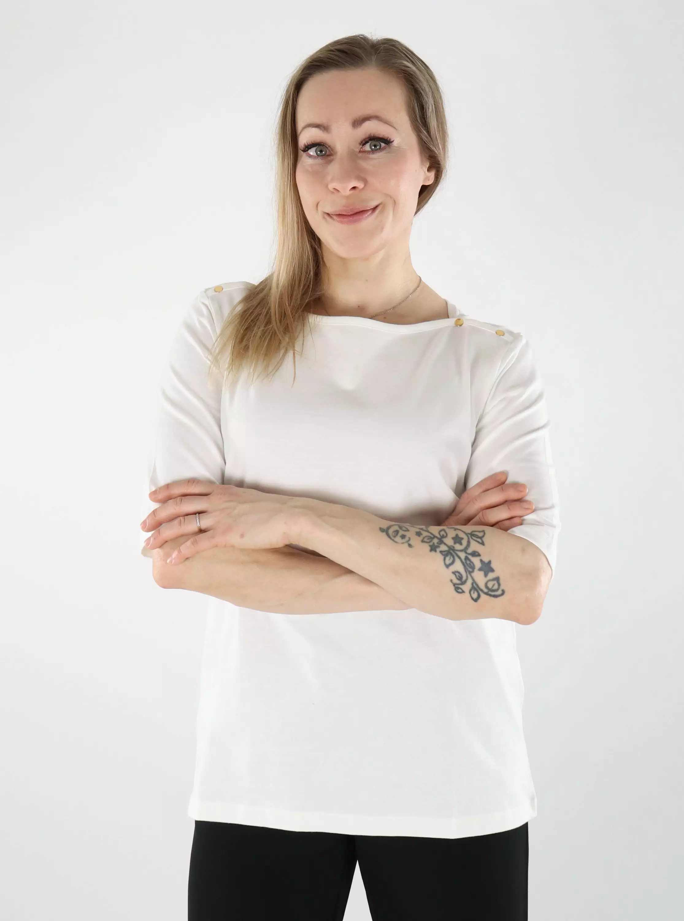 Luomupuuvillainen paita, jonka kauniit kultaiset nappiyksityiskohdat tuovat ripauksen näyttävyyttä! Pehmeä ja hengittävä materiaali tekee paidasta miellyttävän käyttää koko päivän.