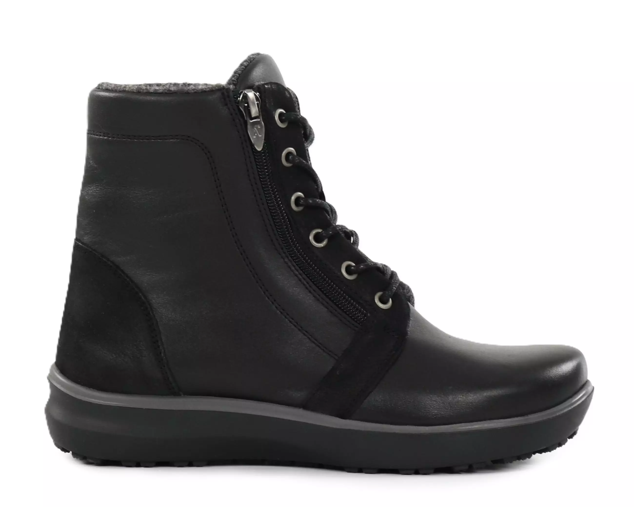Spacious and water-repellent leather ankle boots with a grippy outsole that can also be installed with studs. Zippers on both sides make it easy to put on the shoes.