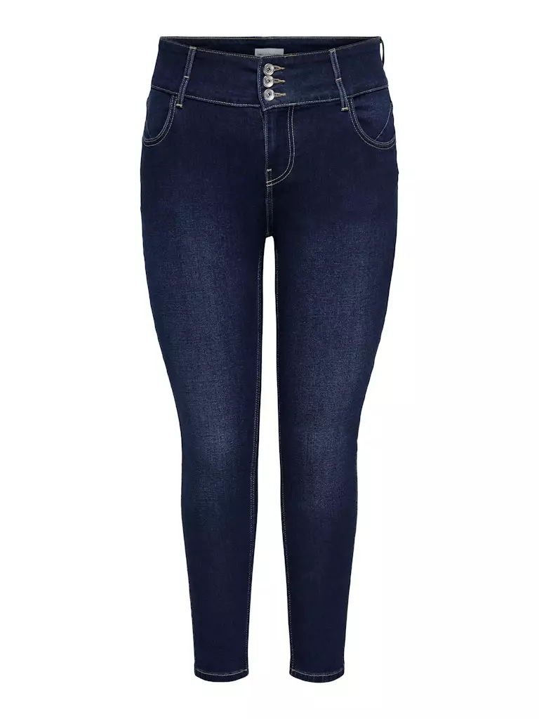 High-waisted jeans with a stylish wide waistband and buttons. Ankle length and narrow legs.