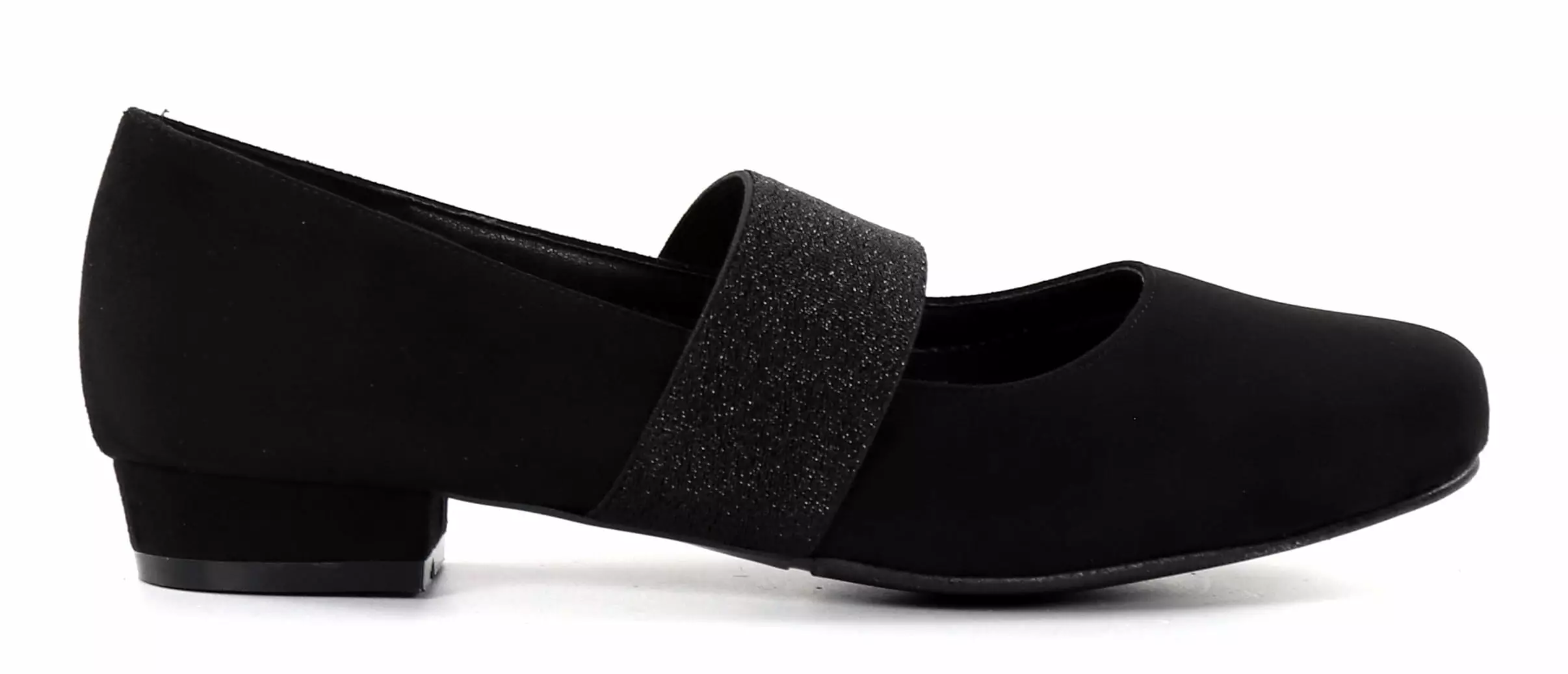 Soft-surfaced ballerinas with an elastic strap on the instep.
