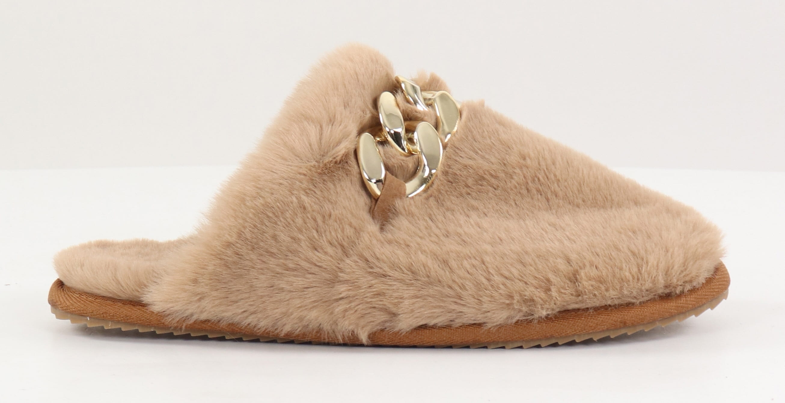 Slip-in-slippers made of soft faux fur, gold colored decorative chain on the top.