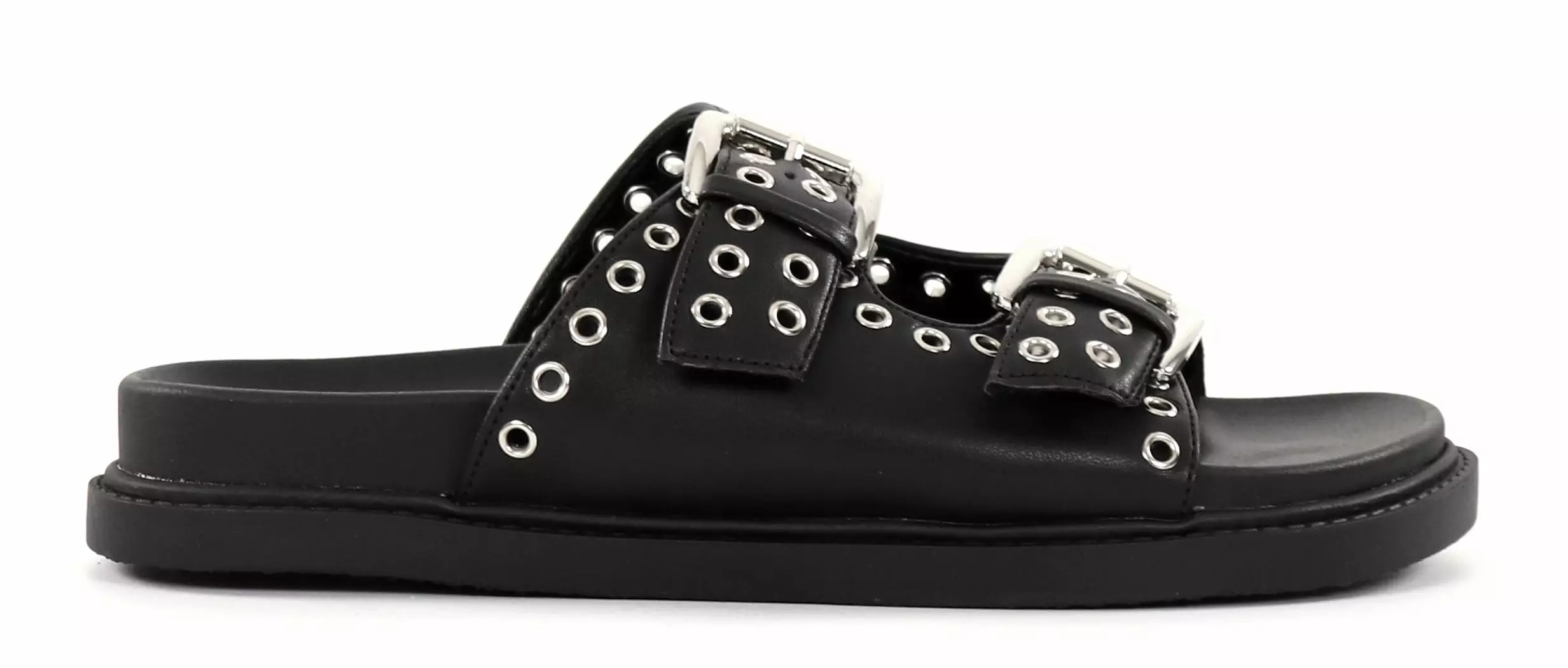 Duffy's black mules with trendy silver buckle and rhinestone details.