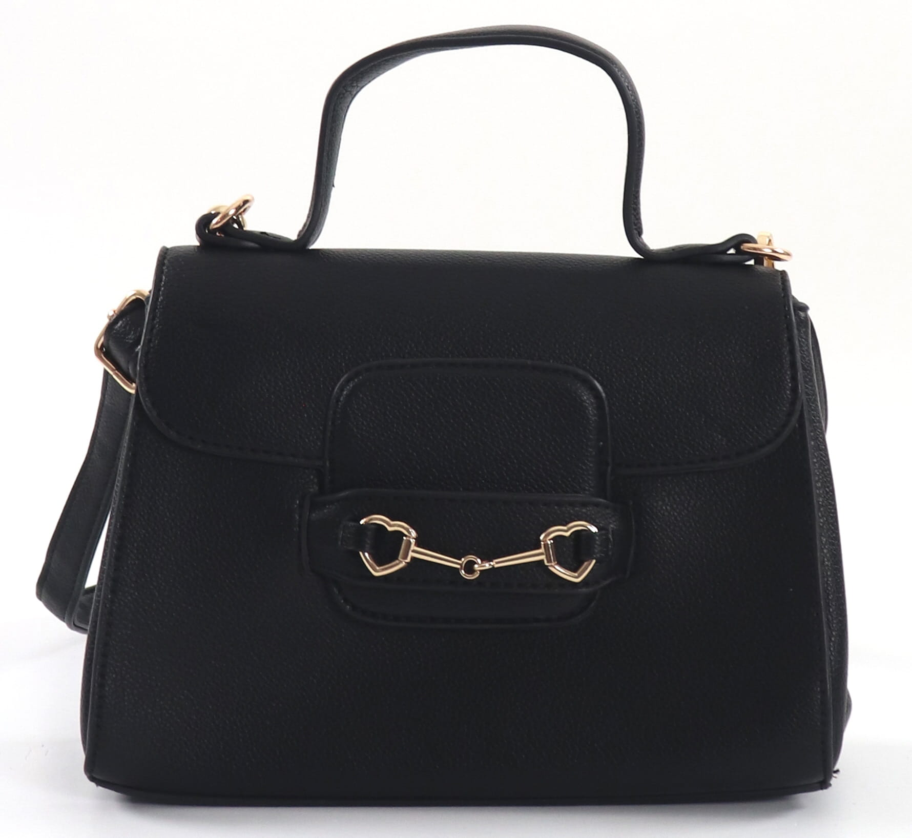 PU coated bag with adjustable and detachable shoulder strap. Fixed carrying handle with gold fasteners. Golden heart detail on the front.