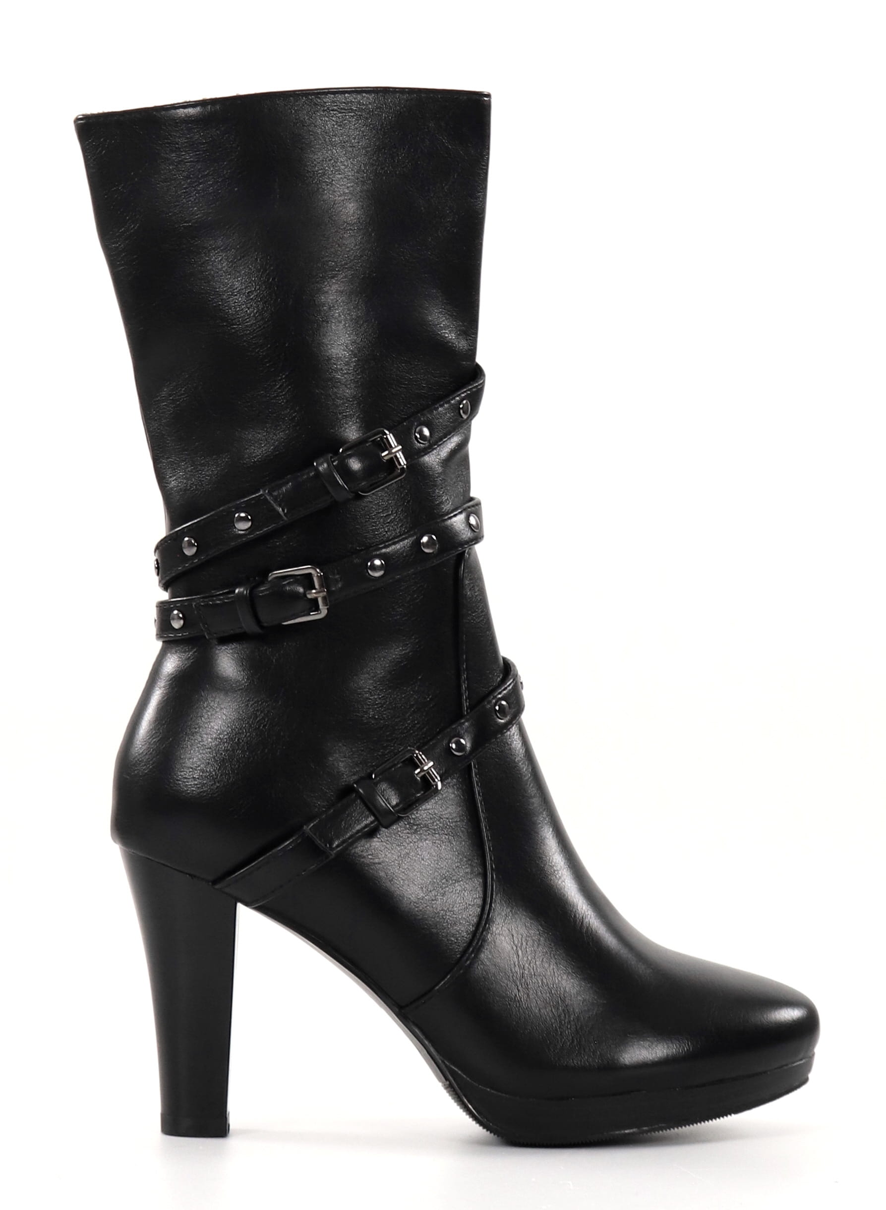 Showy heeled boots with decorative buckles.