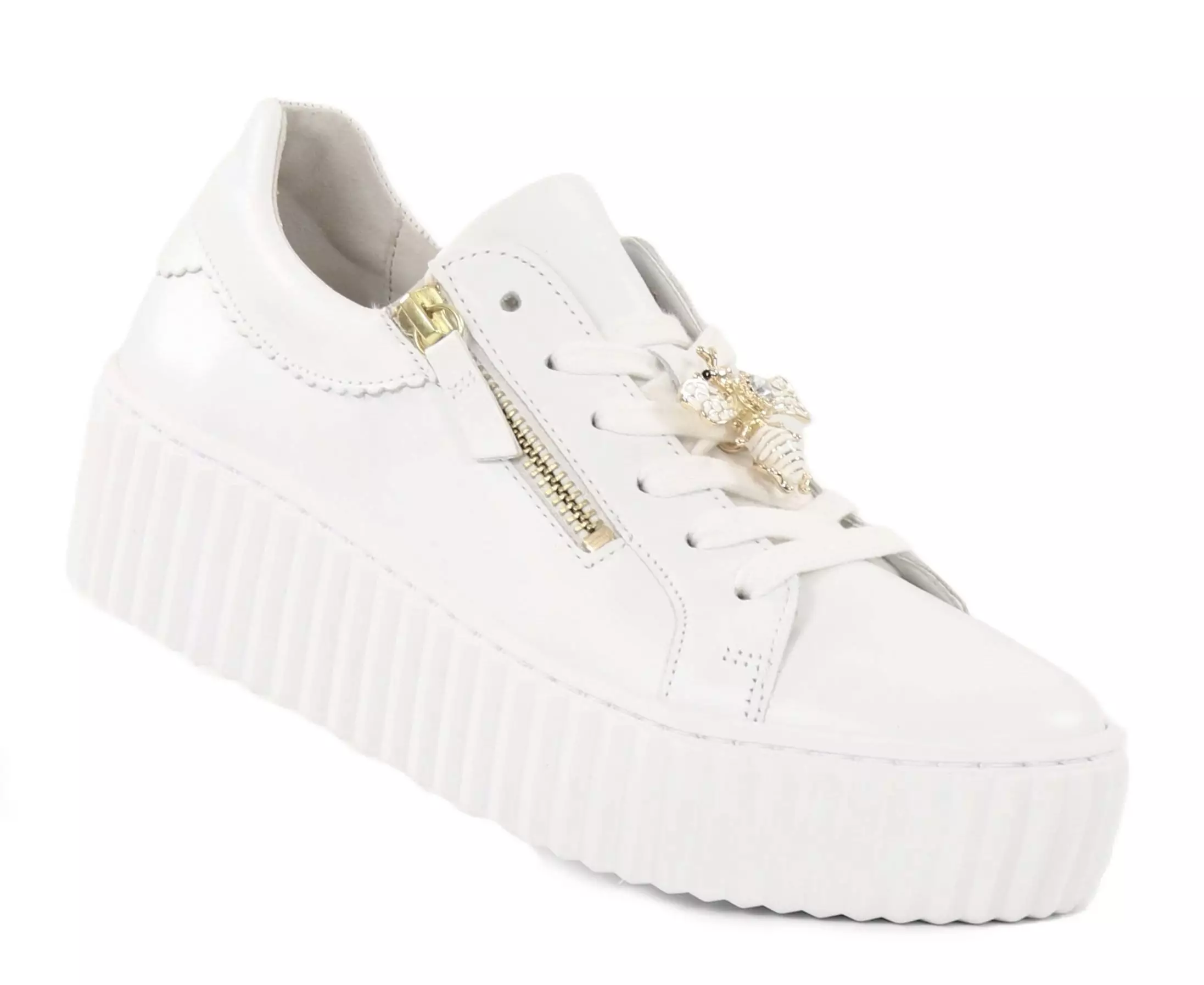 Gabor genuine leather sneakers with gold zippers on both sides that add a touch of glamour and make them easy to put on. The gold decoration on top completes the look of the shoes with a stylish twist!