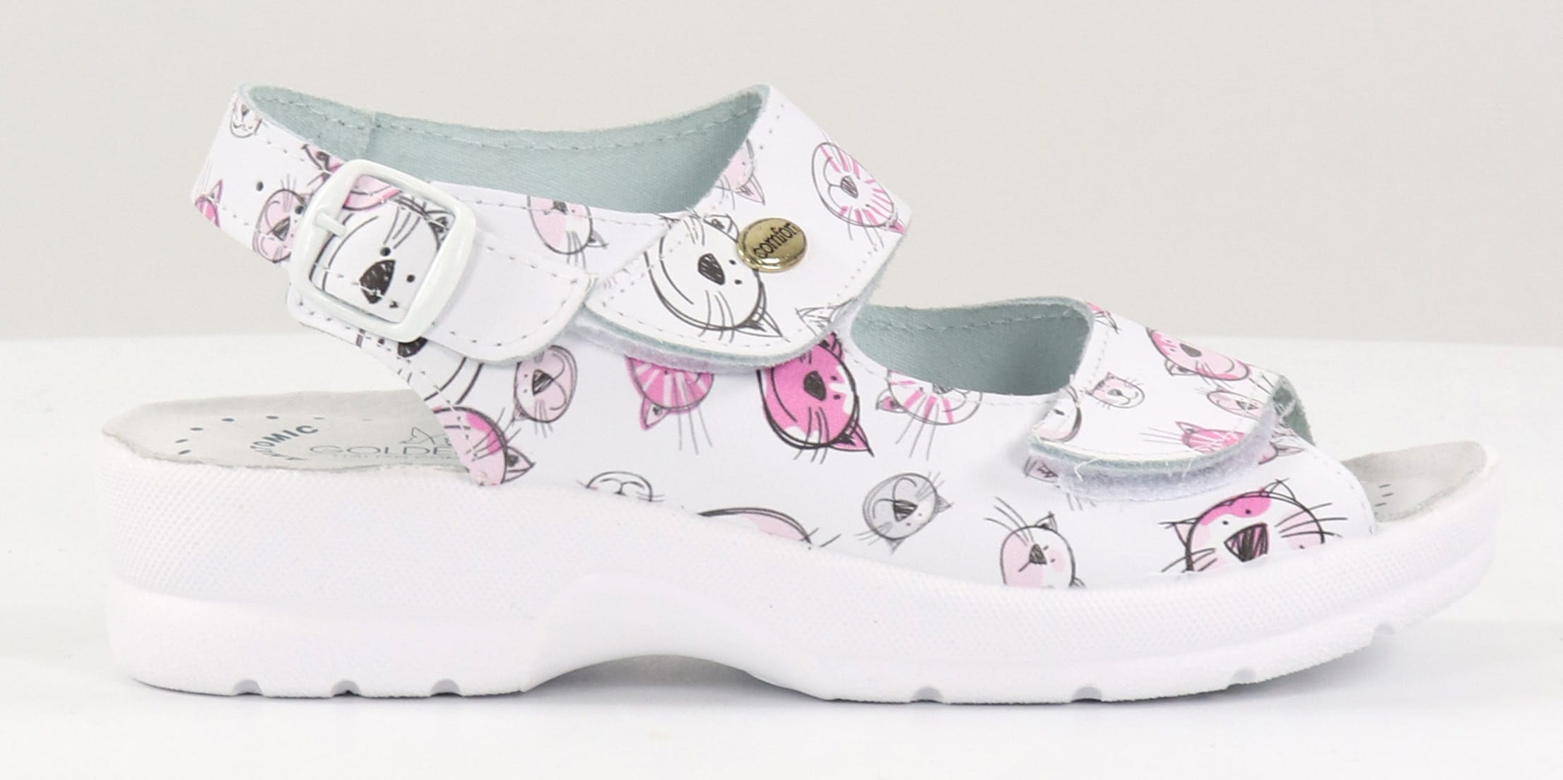 Leather sandals with cat pattern and 3 adjustable straps.