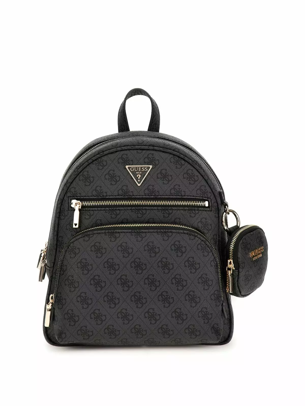 Guess logo patterned backpack with several different pockets and a detachable purse.