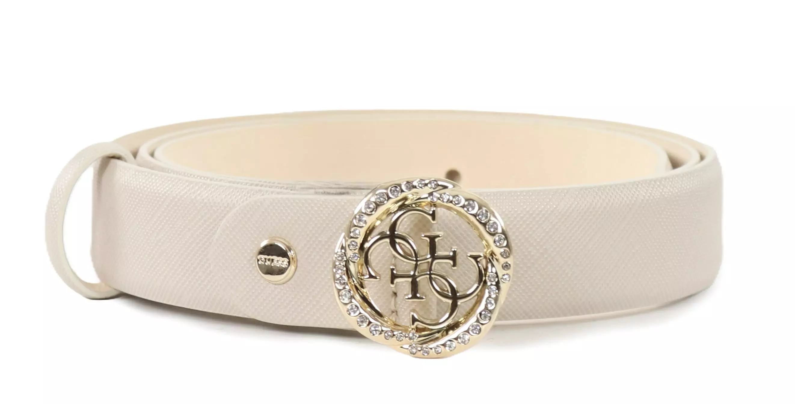 Nude colored Guess belt with gold buckle and diamond details. A discreet and stylish accessory that is easy to combine with different bottoms.