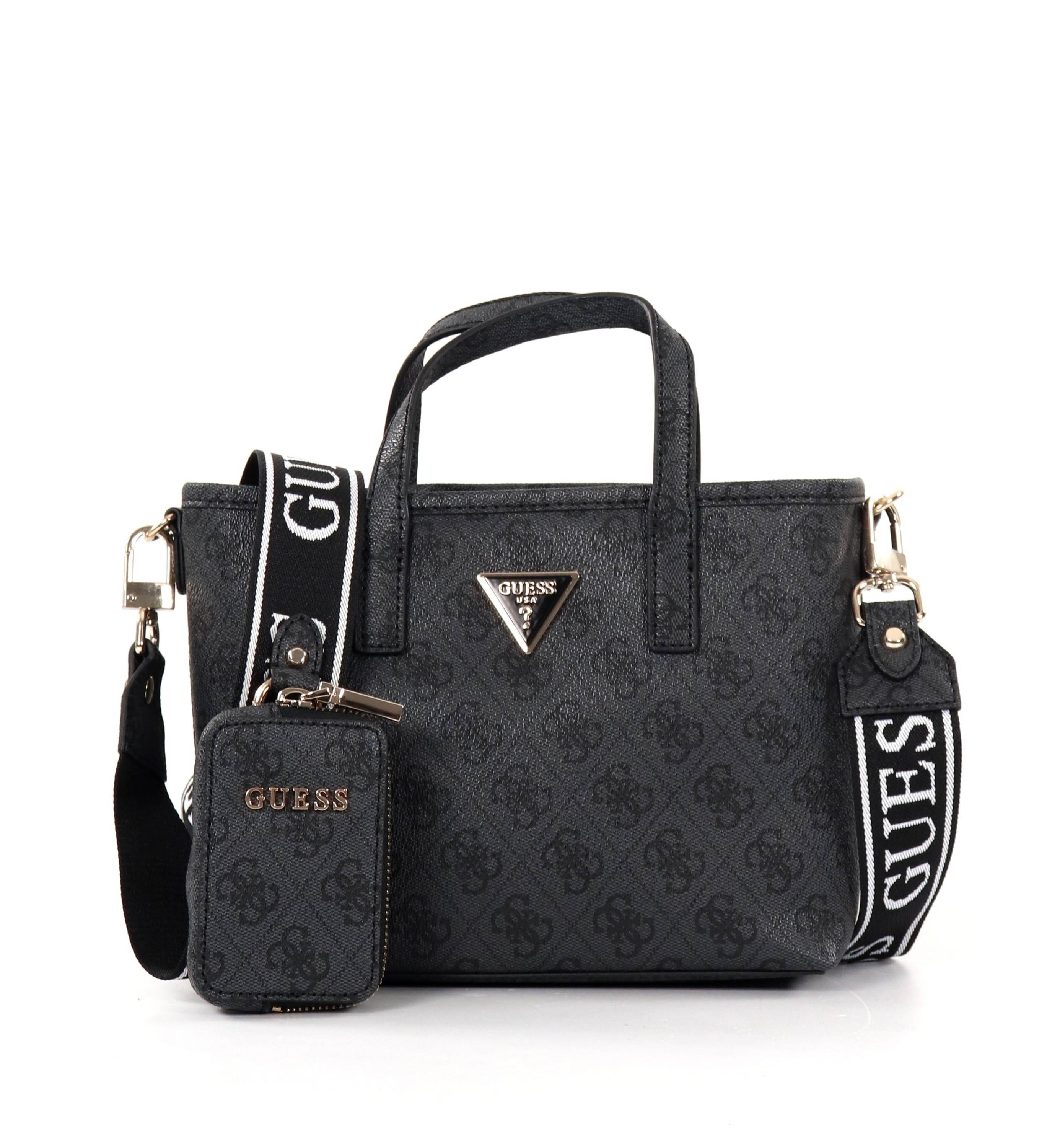 A stylish shoulder bag by Guess, with a smaller bag inside. The wide shoulder strap also has a detachable purse.