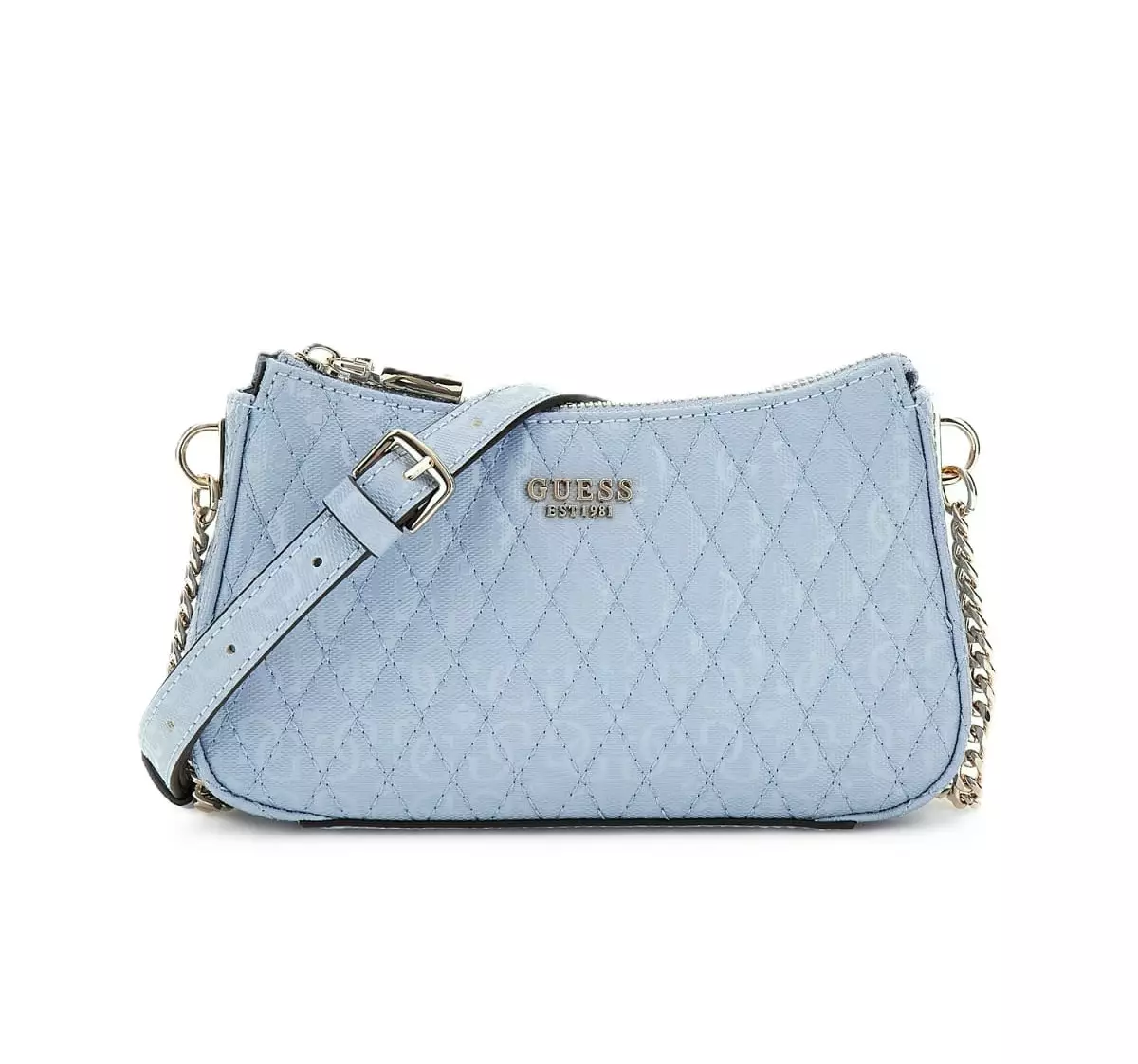 Stylish light blue Guess bag with gold details and a quilted surface.