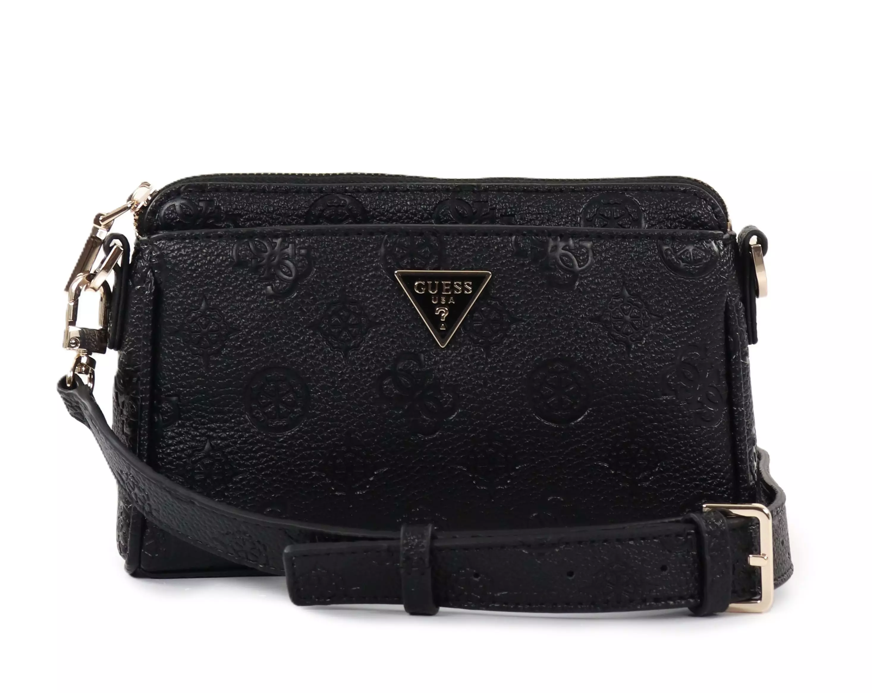 A stylish Guess shoulder bag with a beautiful embossed pattern and striking gold details. A compact but practical choice for everyday life and parties.
