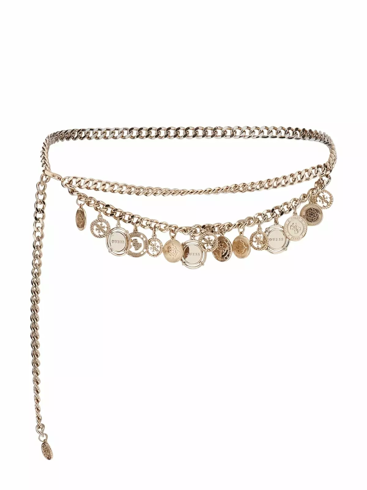 Emphasize your silhouette with a striking waist belt from Guess, featuring multiple Guess embellishments!