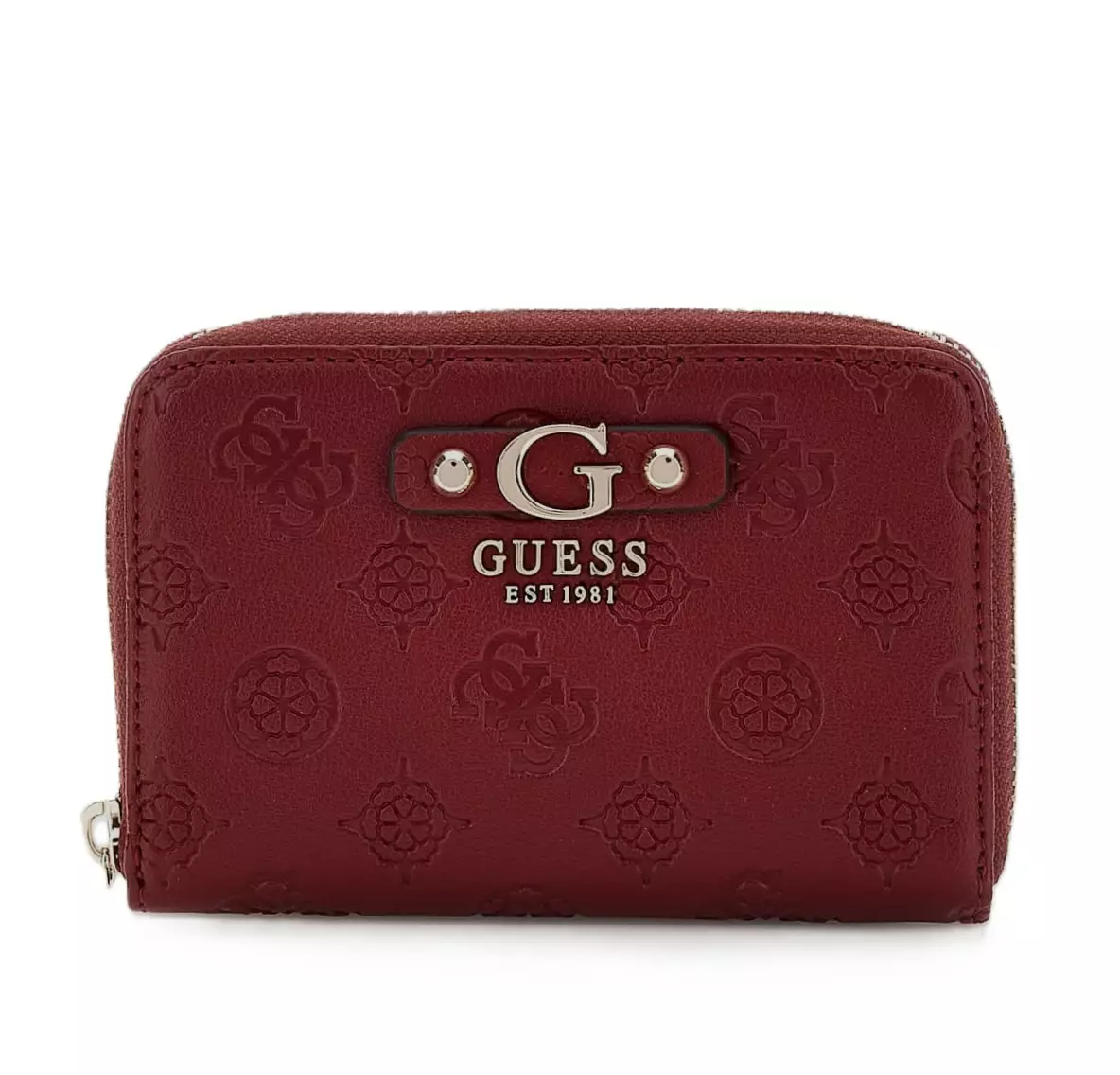 Stylish burgundy Guess wallet with gold details and embossed surface.