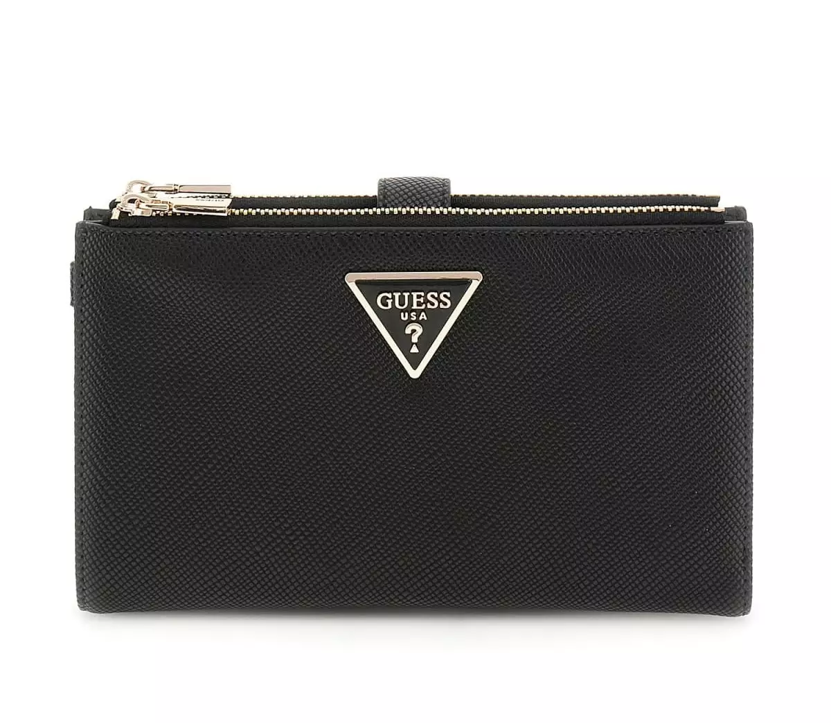 A stylish black Guess wallet that is easy to carry with the included wrist strap. The Guess logo plate on the front gives the wallet a sophisticated look!