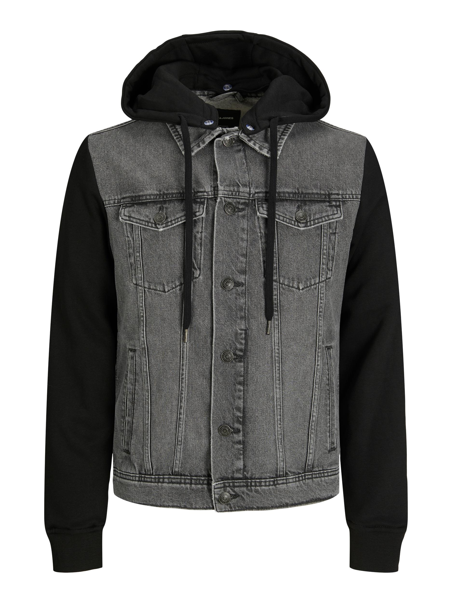 Cotton denim jacket with sweatshirt sleeves and hood!