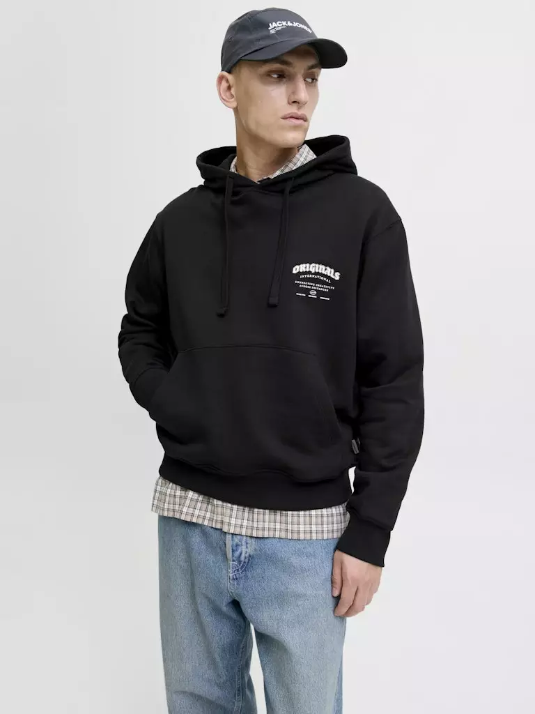 A relaxed and soft hoodie with a kangaroo pocket and a printed inscription on the back.