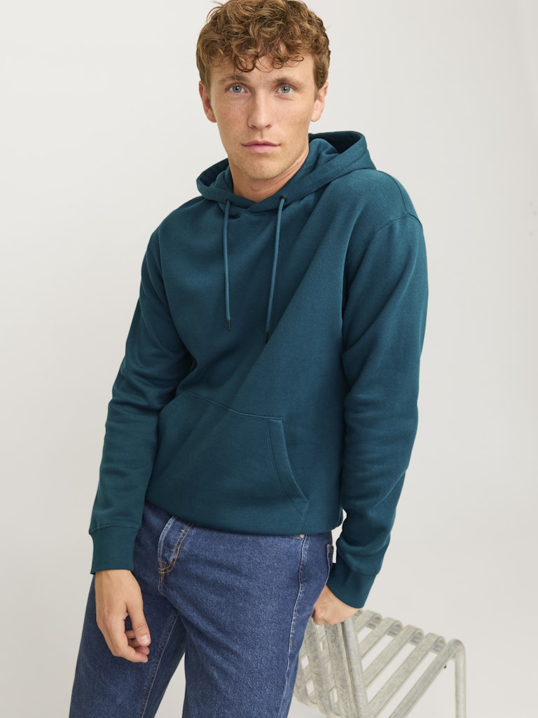 A simple, stylish hoodie with a kangaroo pocket on the front.