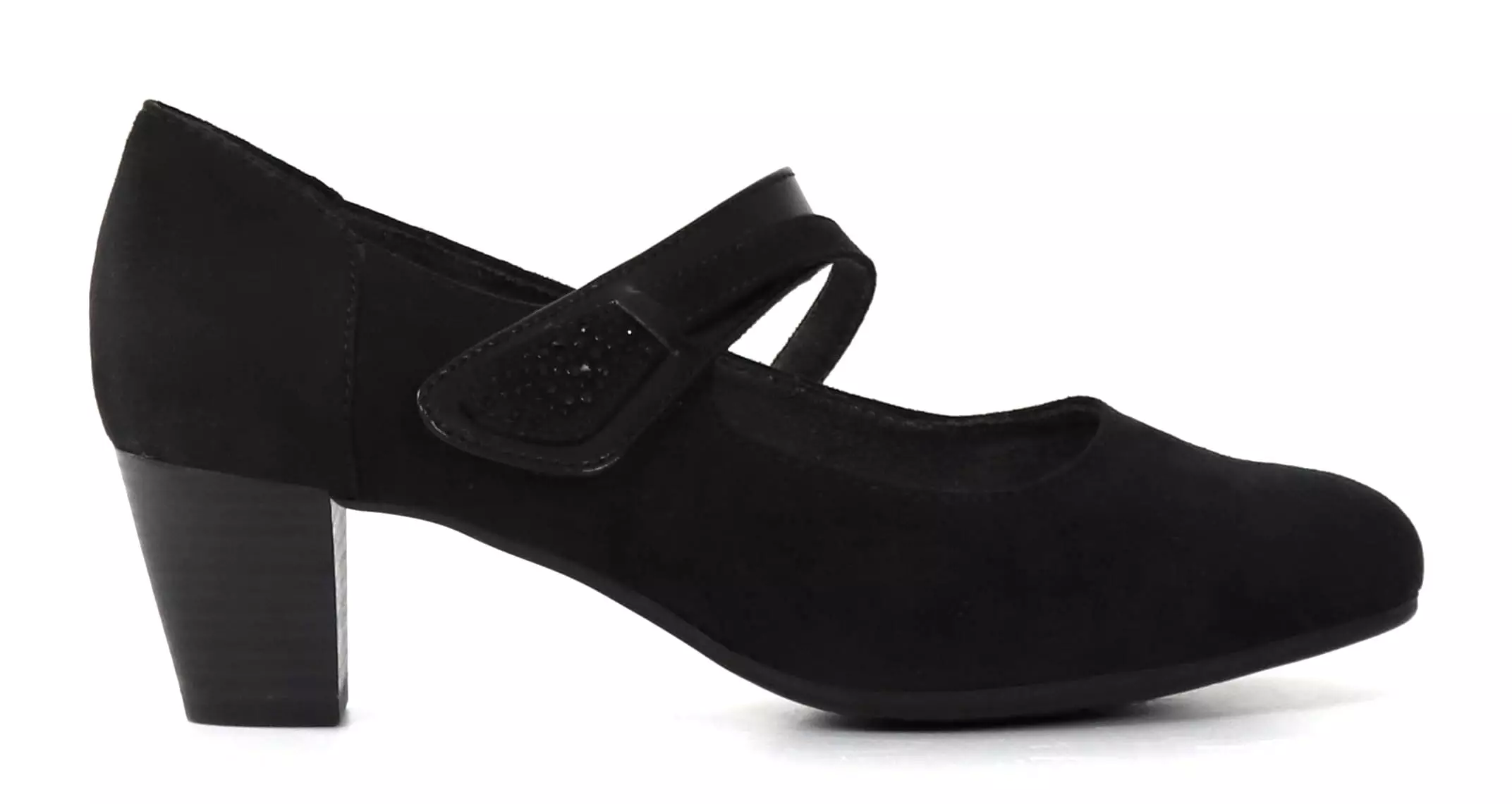 Beautiful pumps with soft insoles and spacious H-last. Velcro strap decorated with rhinestones on top.