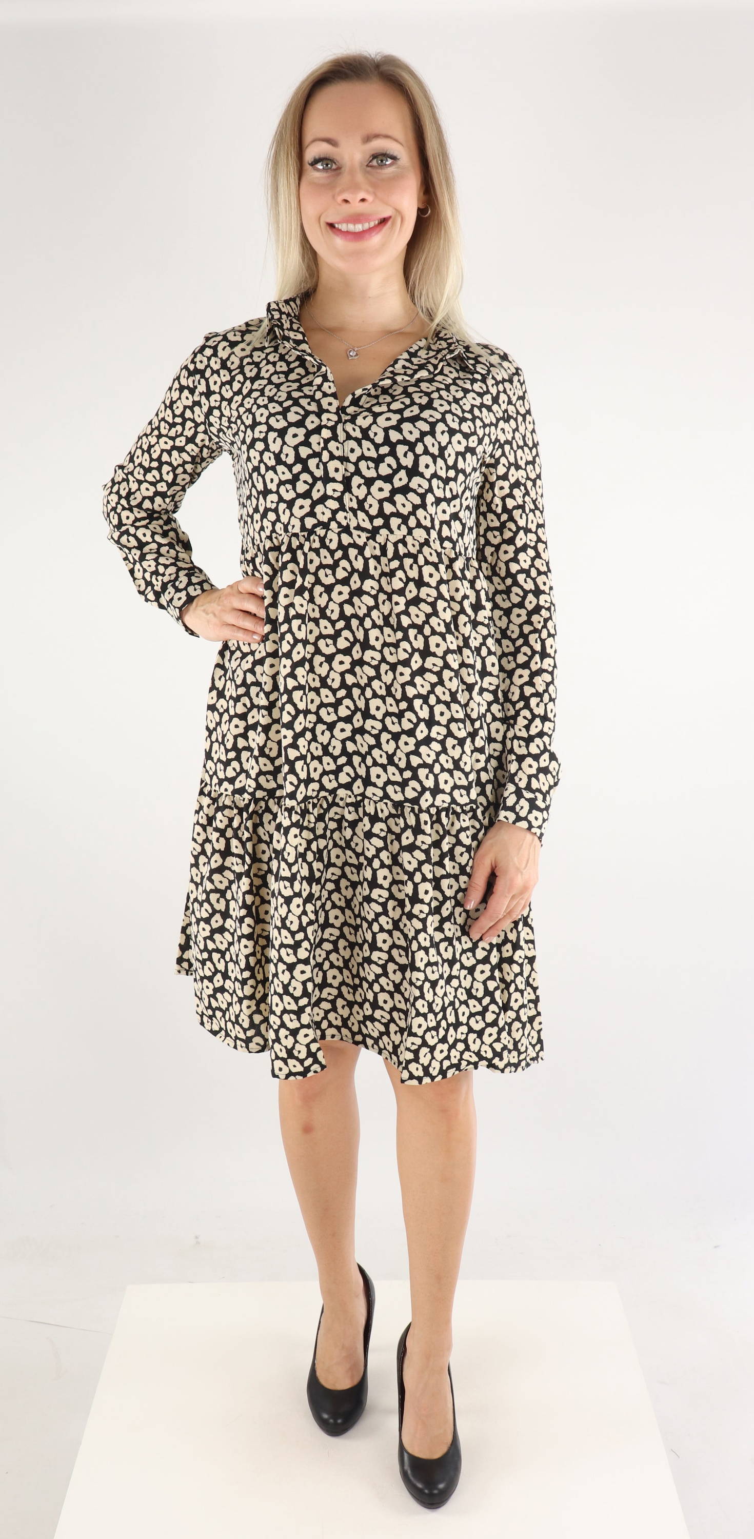 Beautifully draping patterned dress with shirt collar, buttoning on the front and layered hem.