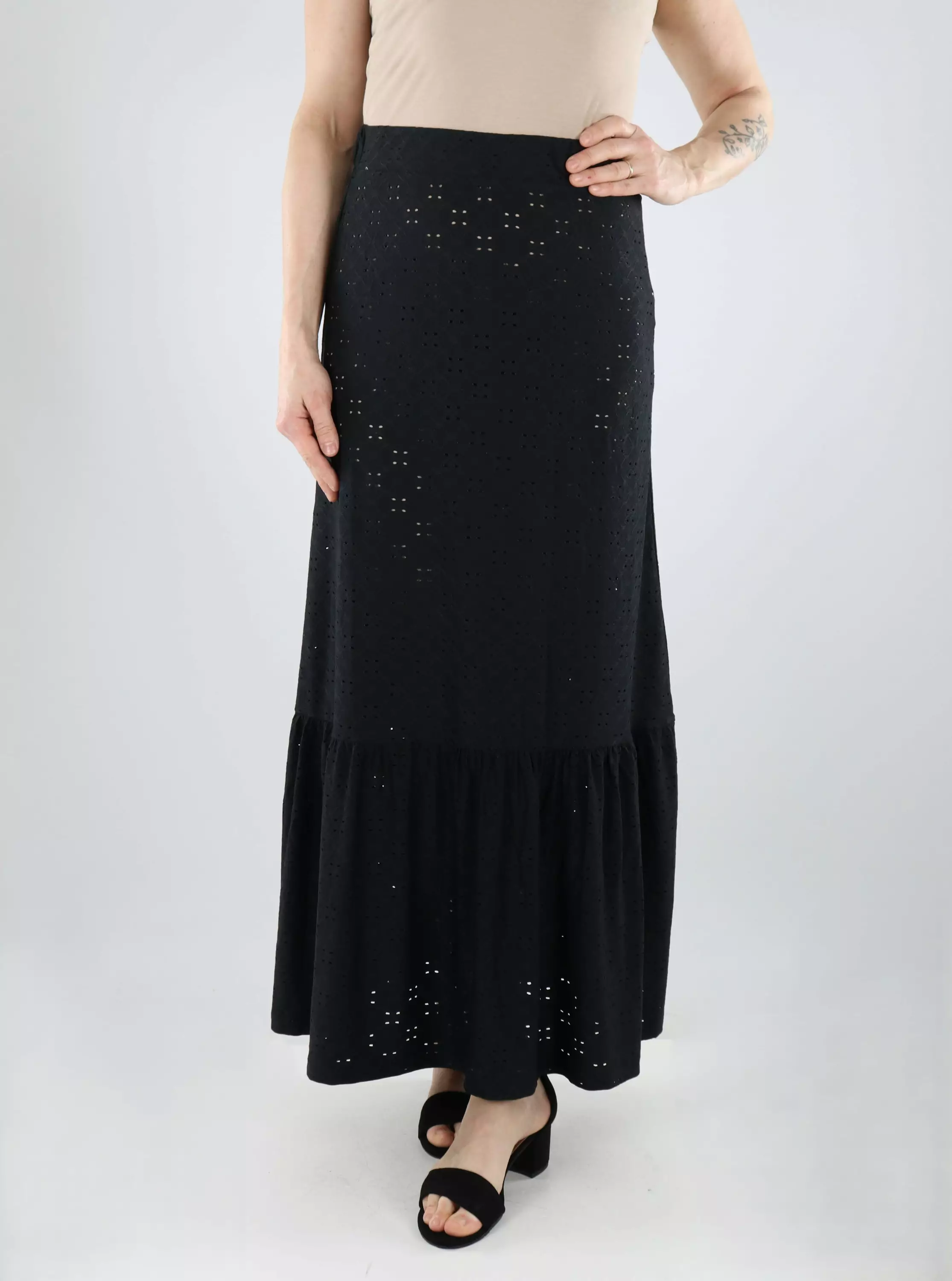 A stretchy and soft ankle-length skirt made of beautiful perforated fabric. The slightly flowing design makes it a comfortable and airy choice for both everyday and leisure wear.