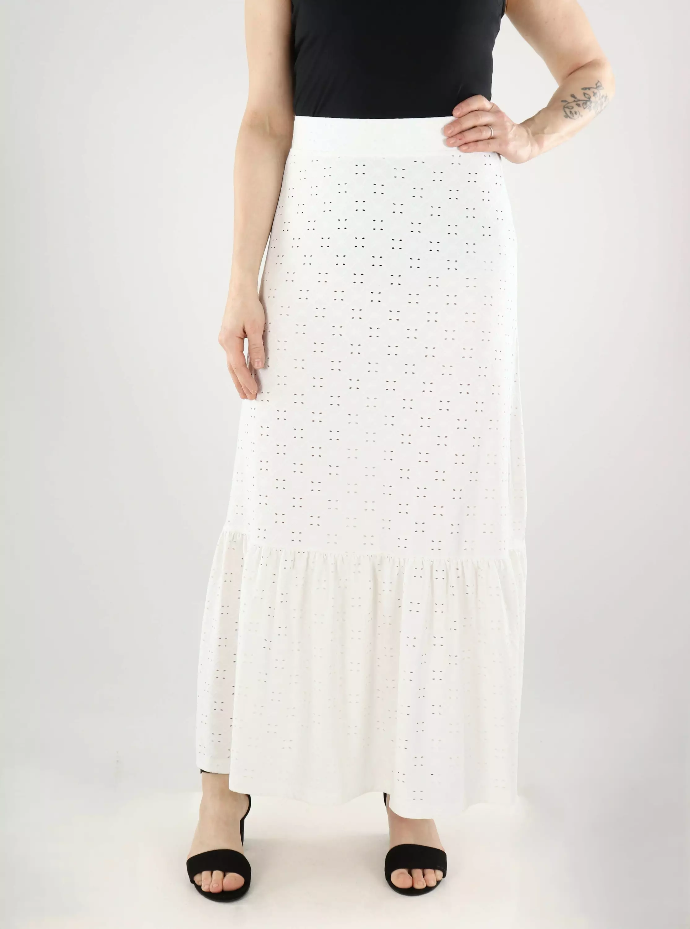 A stretchy and soft ankle-length skirt made of beautiful perforated fabric. The slightly flowing design makes it a comfortable and airy choice for both everyday and leisure wear.