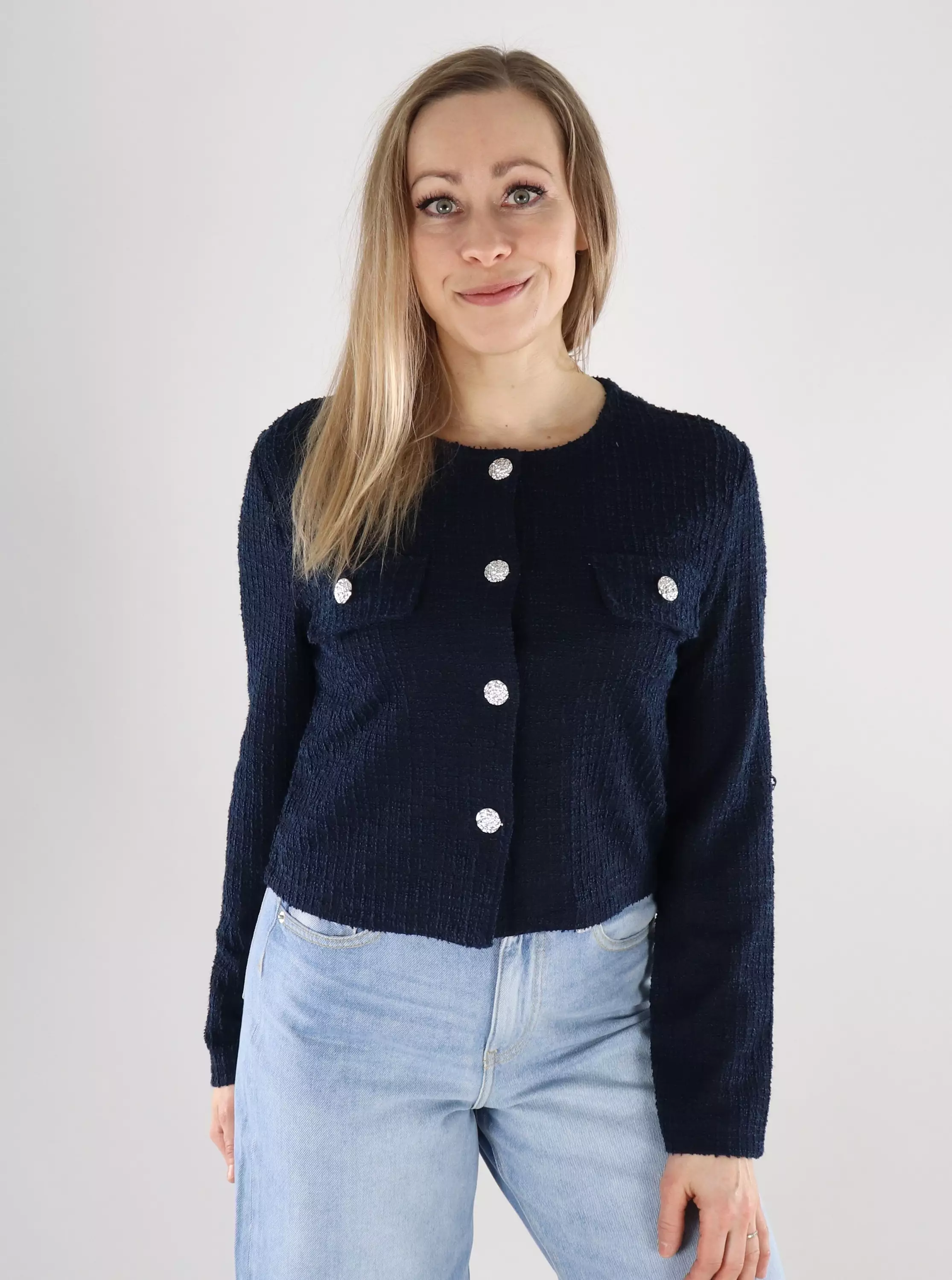 JDY's short jacket is a versatile choice that is suitable for both everyday and more formal occasions. The stylish cut, boucle finish and silver buttons give the outfit a finished look.