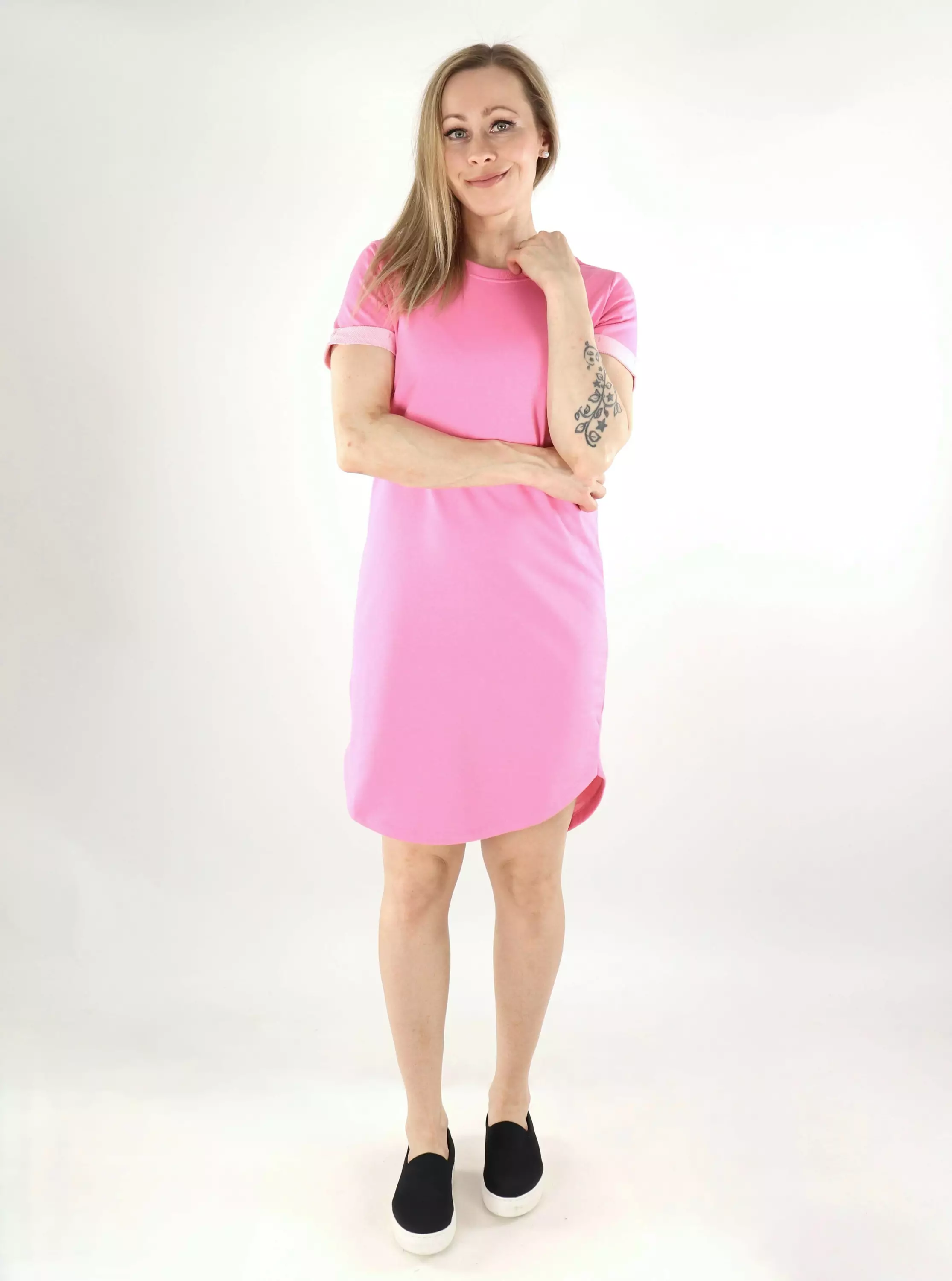 This short-sleeved pink sweatshirt dress is the perfect choice for a casual yet stylish look. The rolled-up cuffs give the dress a fresh look, and the soft material adds comfort.