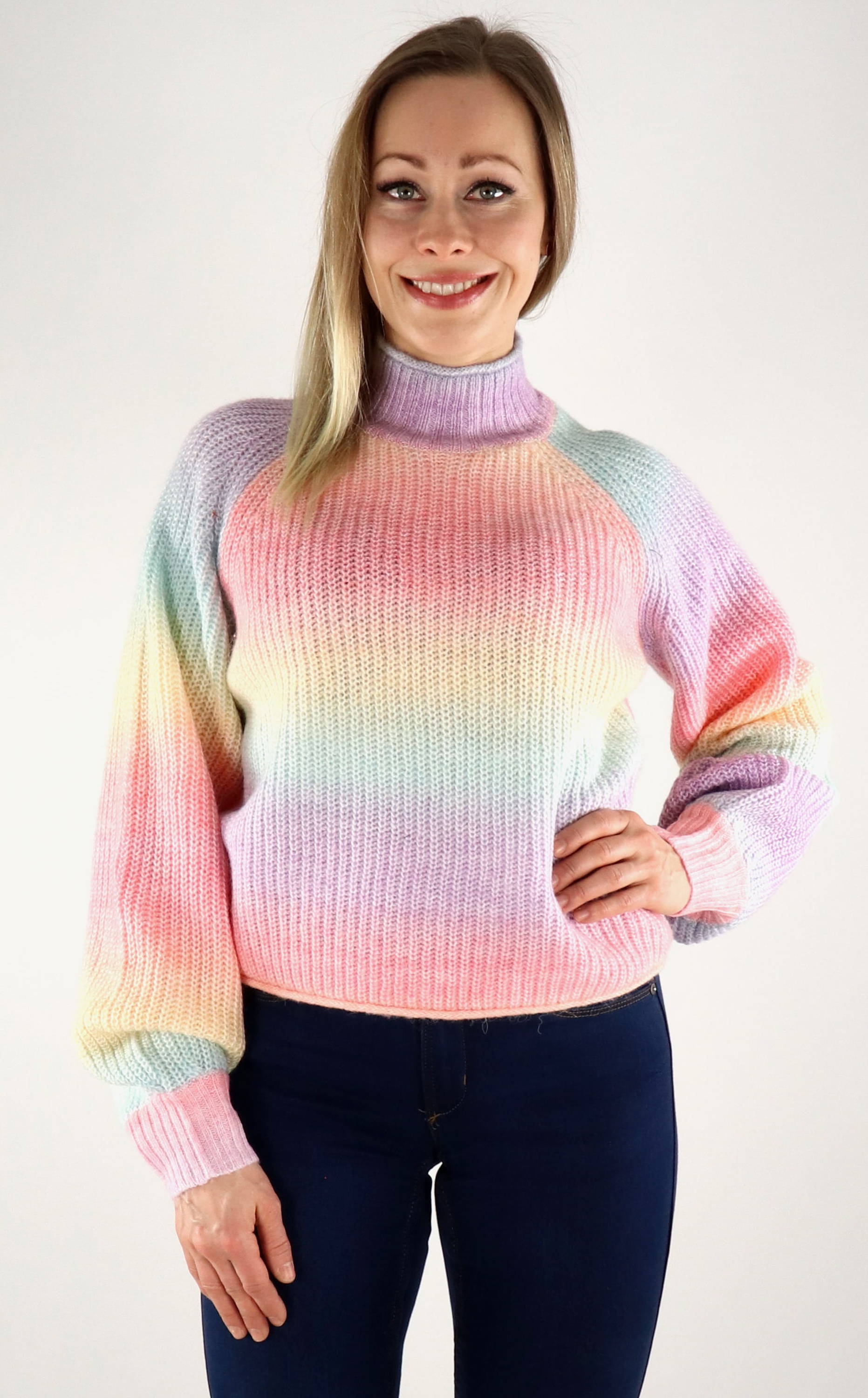 A wonderfully cheerful sweater with a high collar and puff sleeves