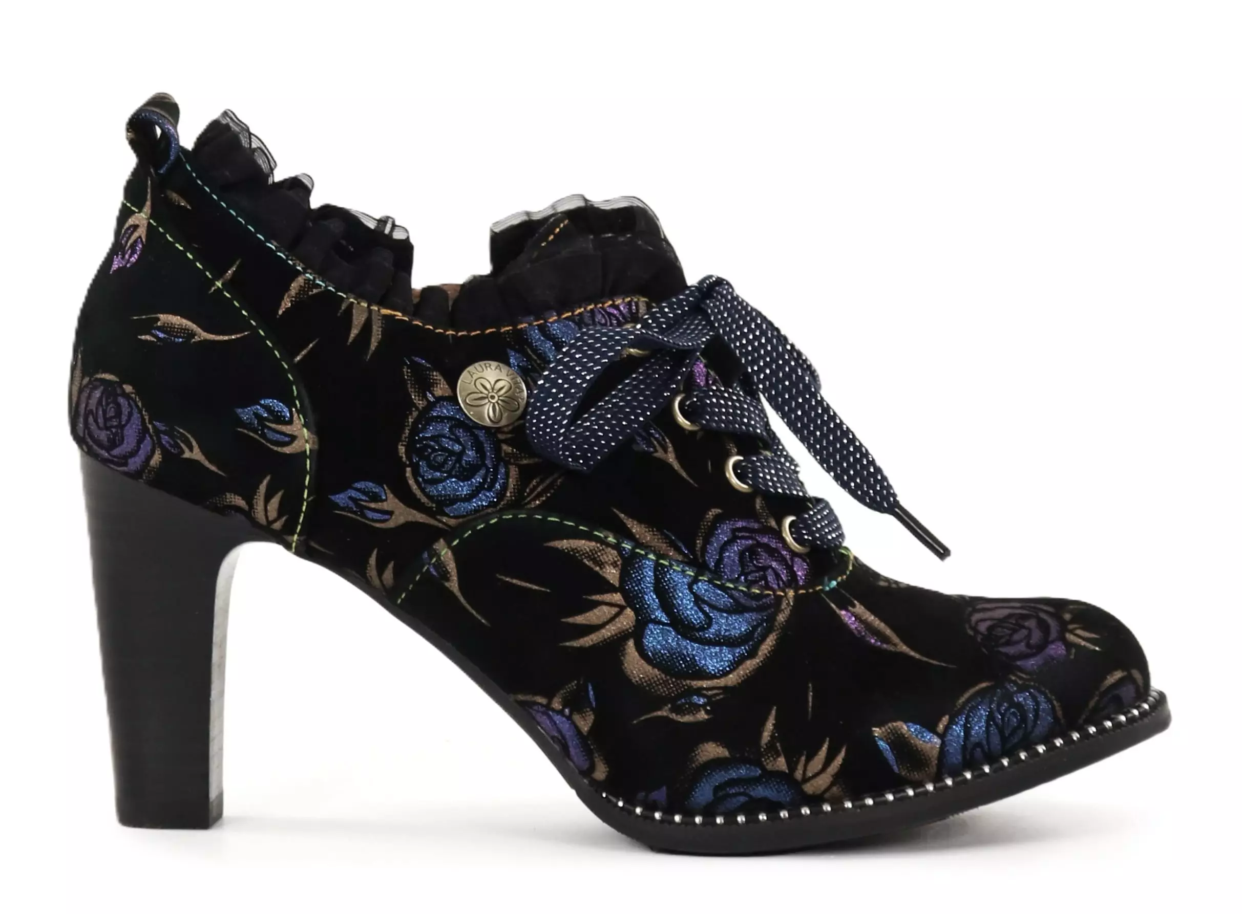 These charming Laura Vita walking shoes combine a beautiful rose pattern, colorful stitching and a feminine frill hem. The high-heeled model brings poise to your steps!
