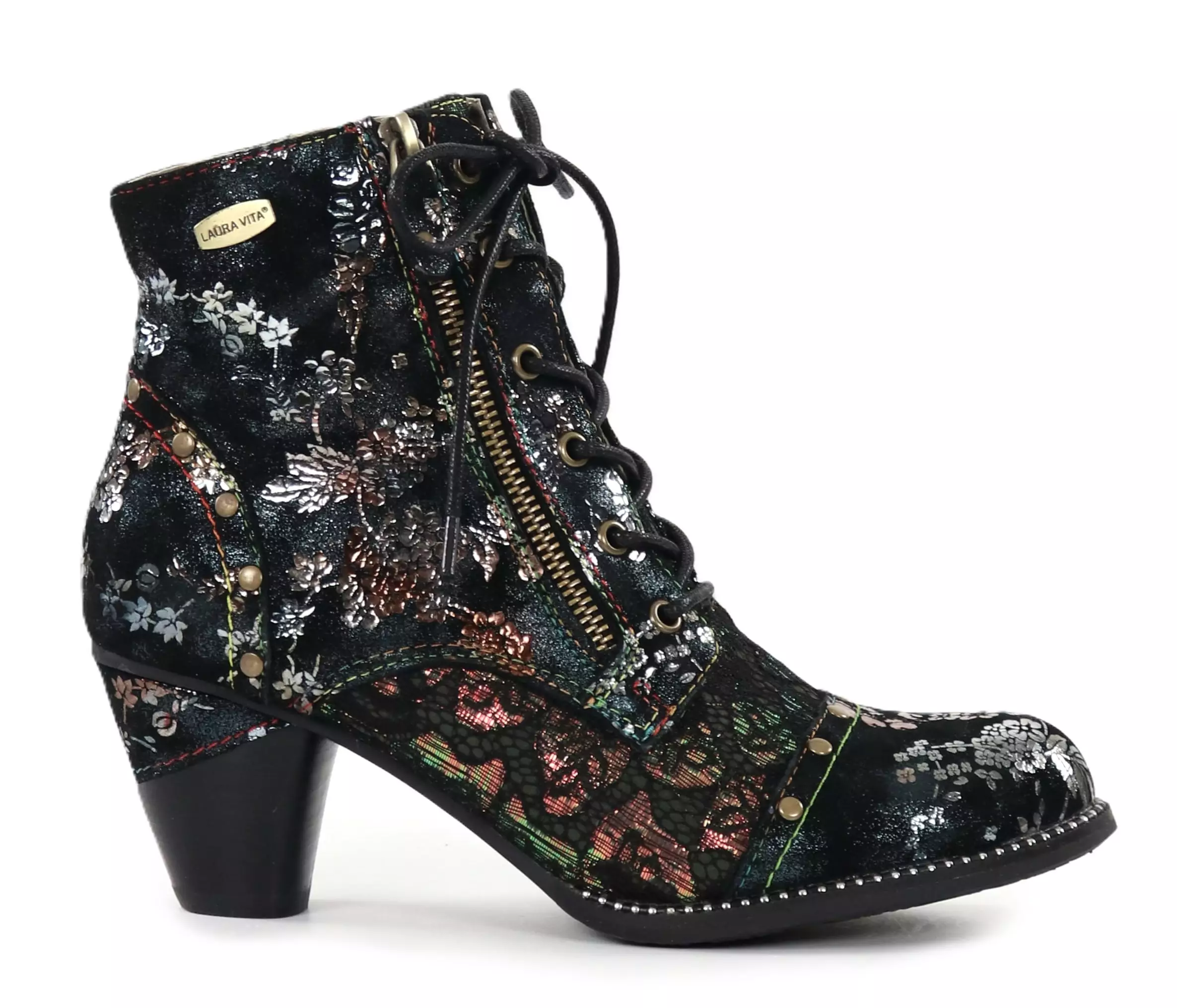 These Laura Vita ankle boots combine a striking pattern, sturdy platform heels and carefully finished details. The lacing on the top provides adjustability, the zipper on the inside makes it easy to put on and the decorative zipper on the outside completes the look.