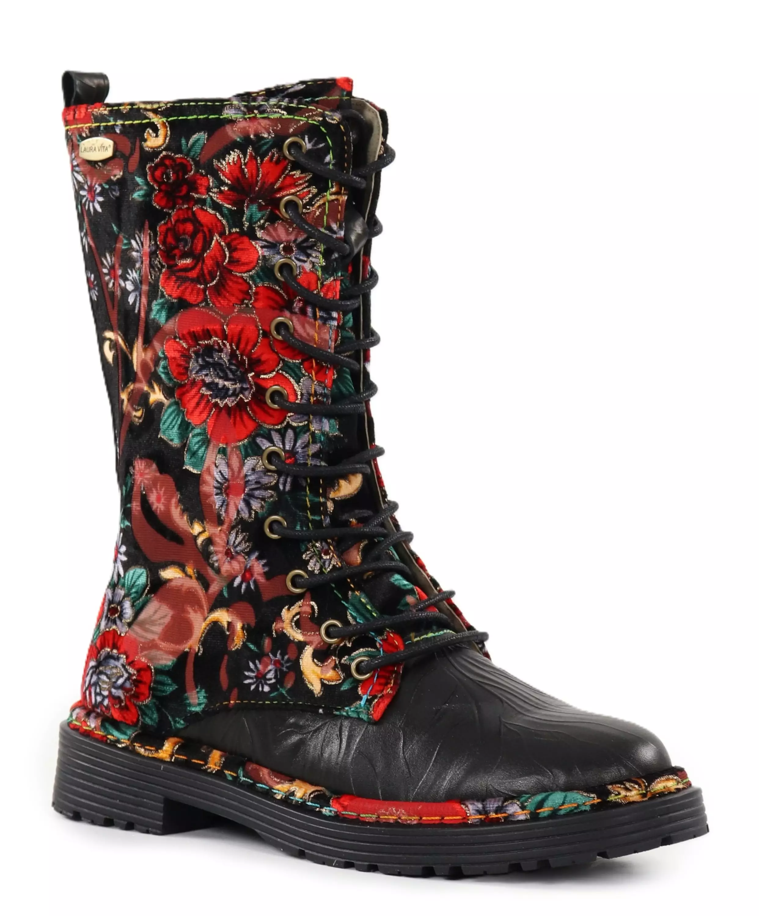 Laura Vita's ankle boots with a lace-up design are charming with their personal look! The high upper and feminine red floral pattern create a great contrast to the rough combat boot style. The side zipper brings ease to everyday life, and the lacing completes the fit. With these shoes, you will take your style to a new level!