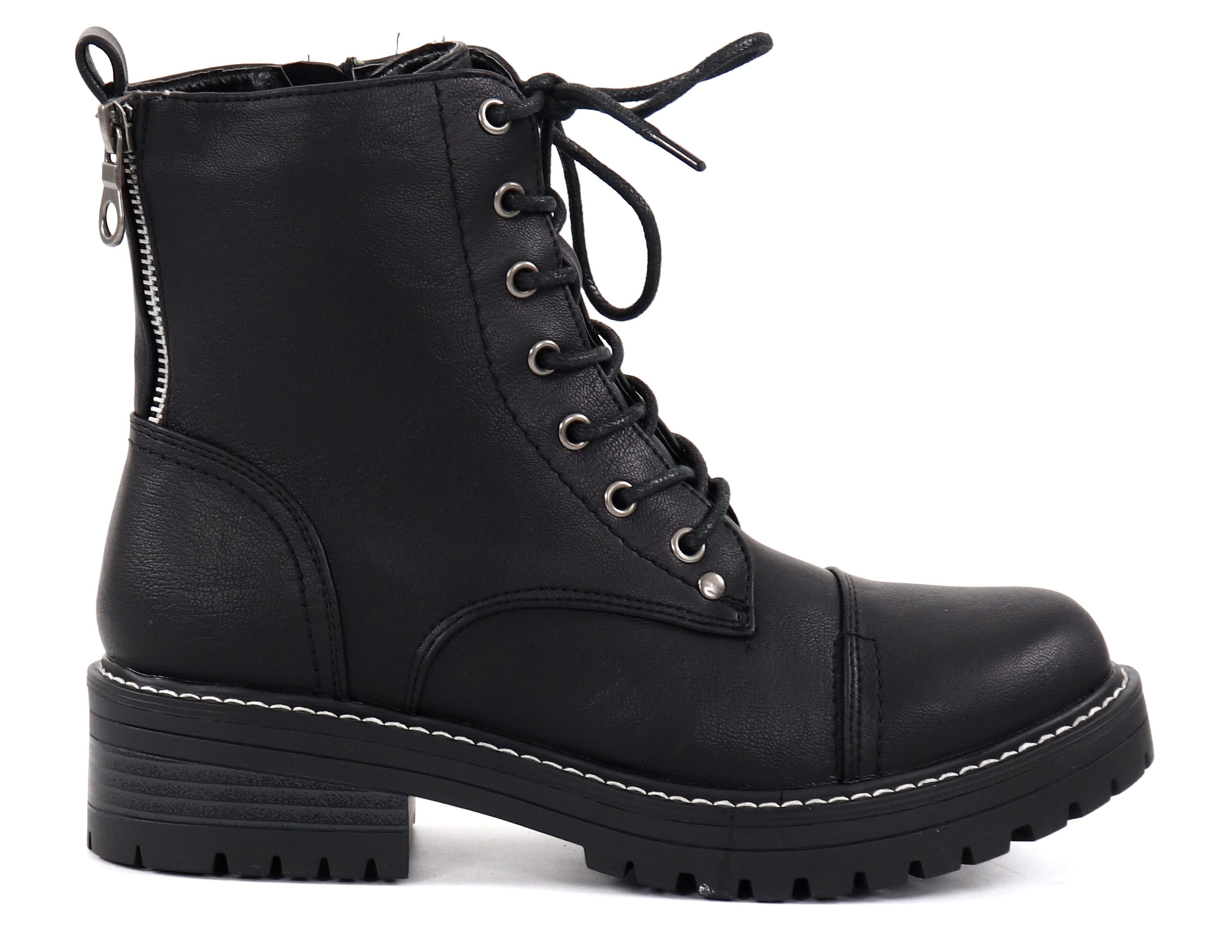 Synthetic leather ankle boots with thin fur lining and zipper on the inner side.