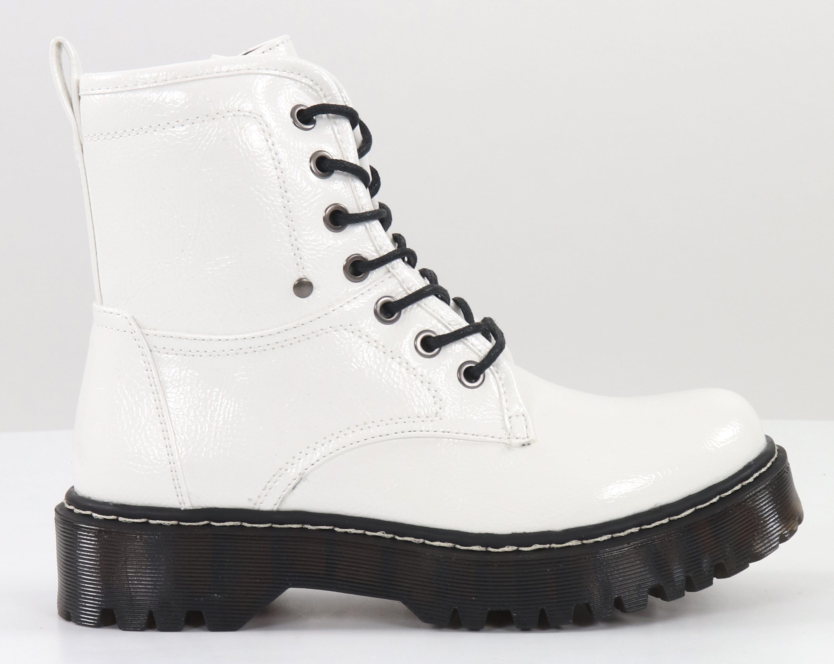 Shiny synthetic leather ankle boots with thin fur lining.