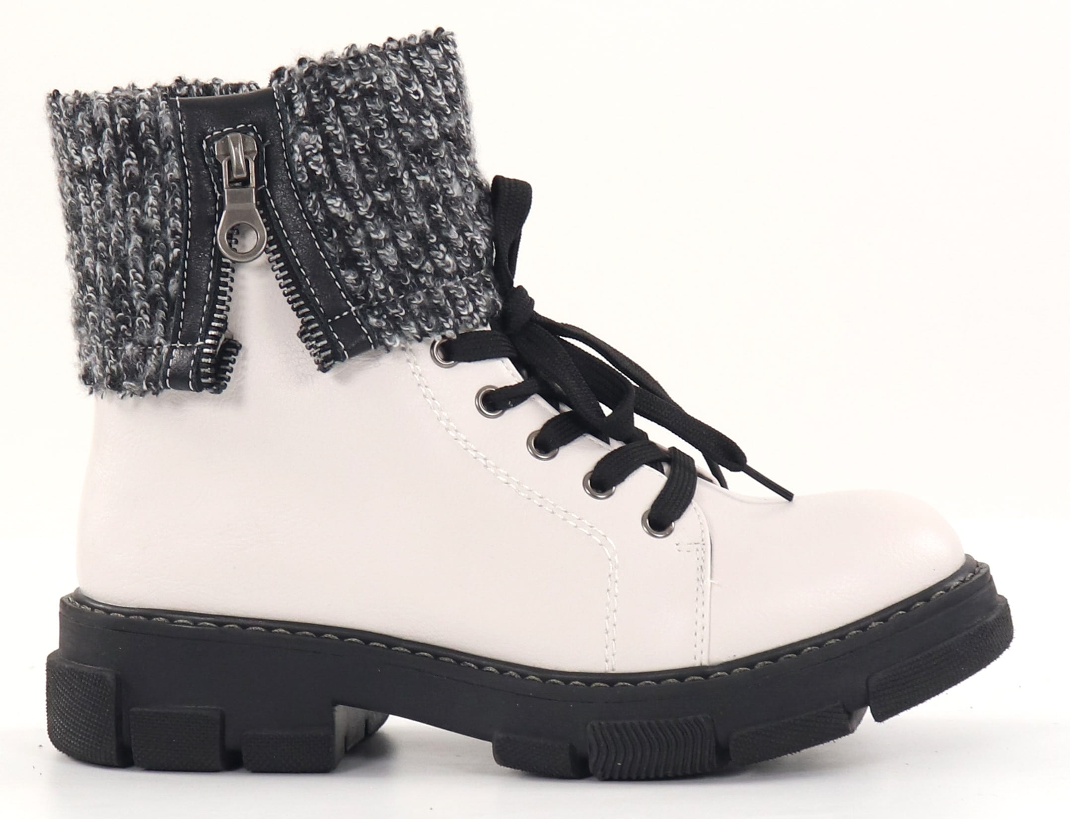Ankle boots with a decorative knitted arm. Zipper fastening.