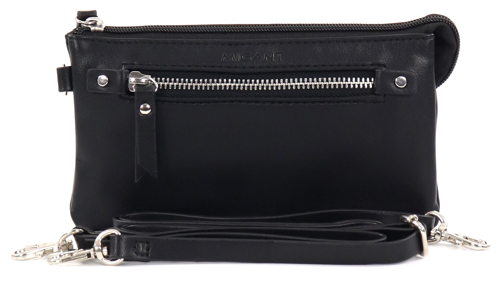 Synthetic material small bag with detachable shoulder strap and wrist loop.