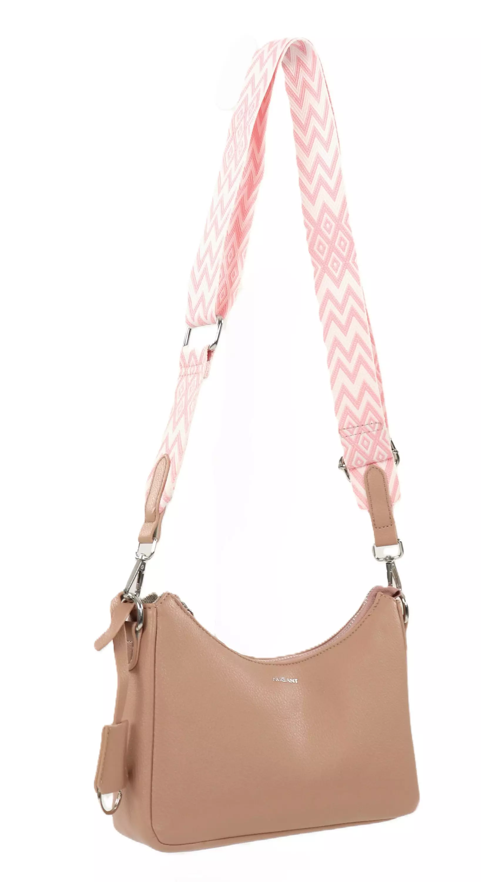 This stylish Migant shoulder bag combines practicality and trendiness. Comes with two removable straps: a wide, patterned textile strap for a more casual style and a narrow faux leather strap for a more elegant look.