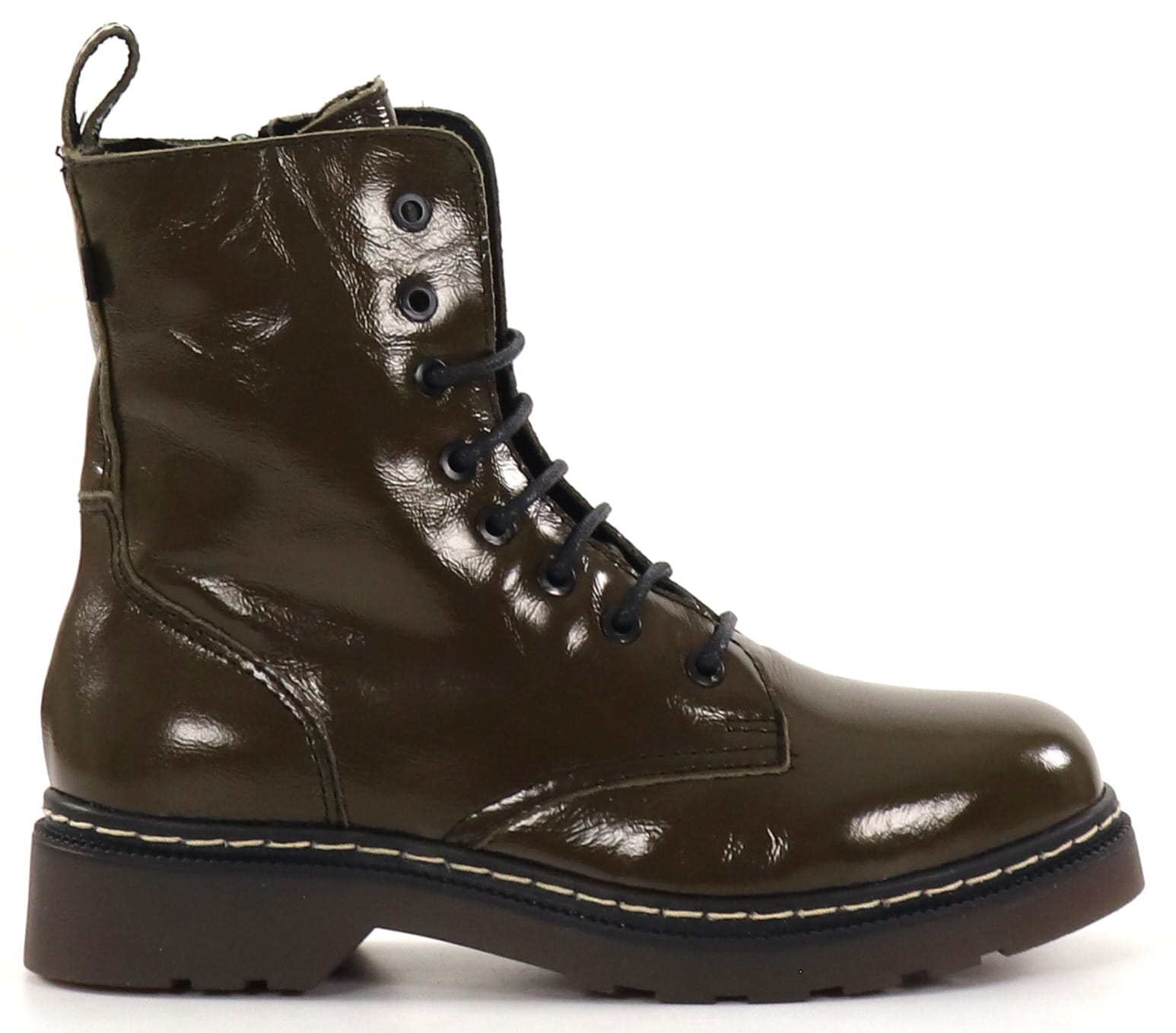 Shiny combat boots in leather, laces on the front and a zipper on the inner side.