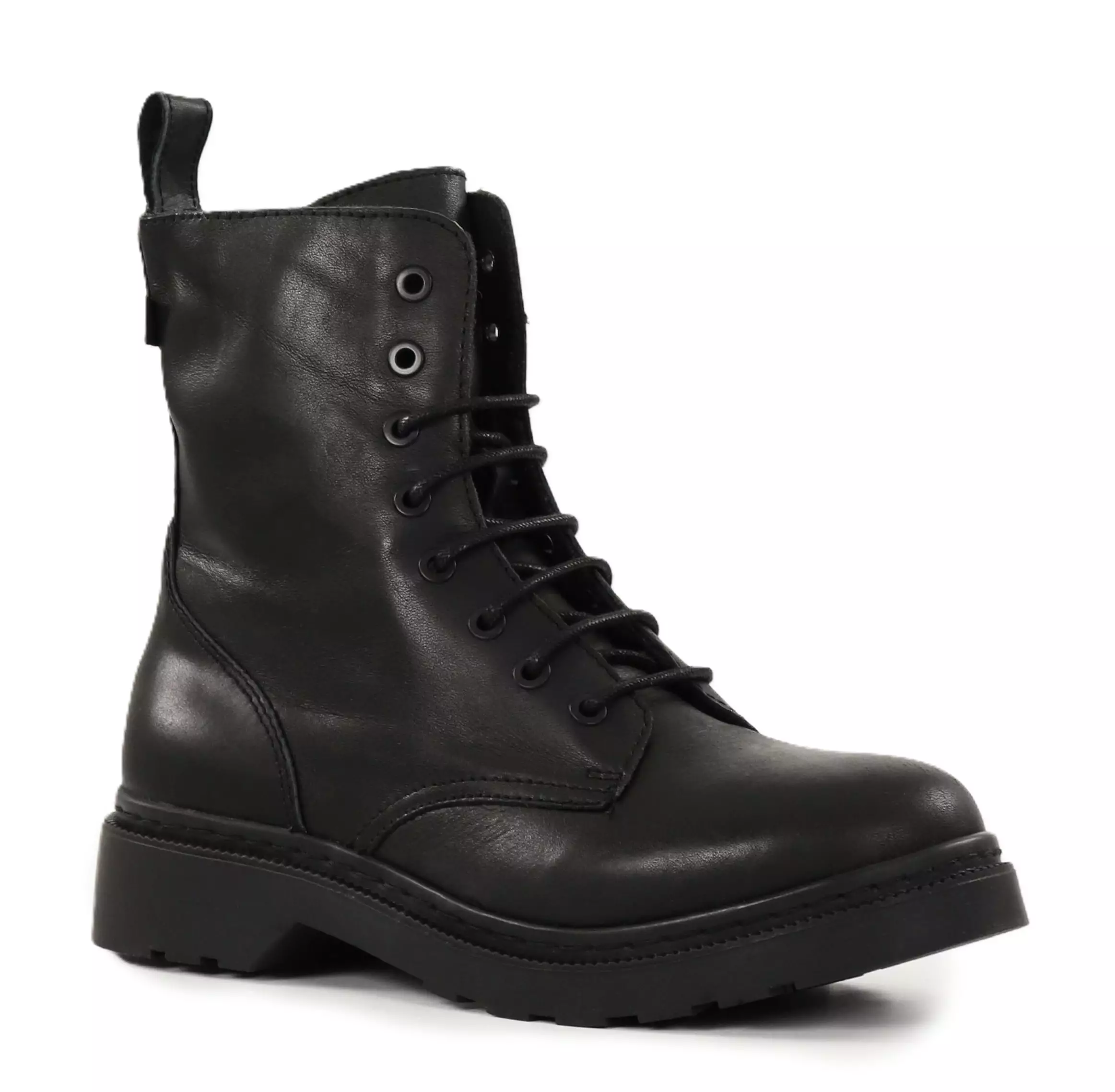 Black ankle boots with a ribbed design that combine a rugged look and practicality. The side zipper makes it easy to put on, and the lacing allows you to adjust the shoes to fit your feet. The perfect choice for versatile everyday wear!