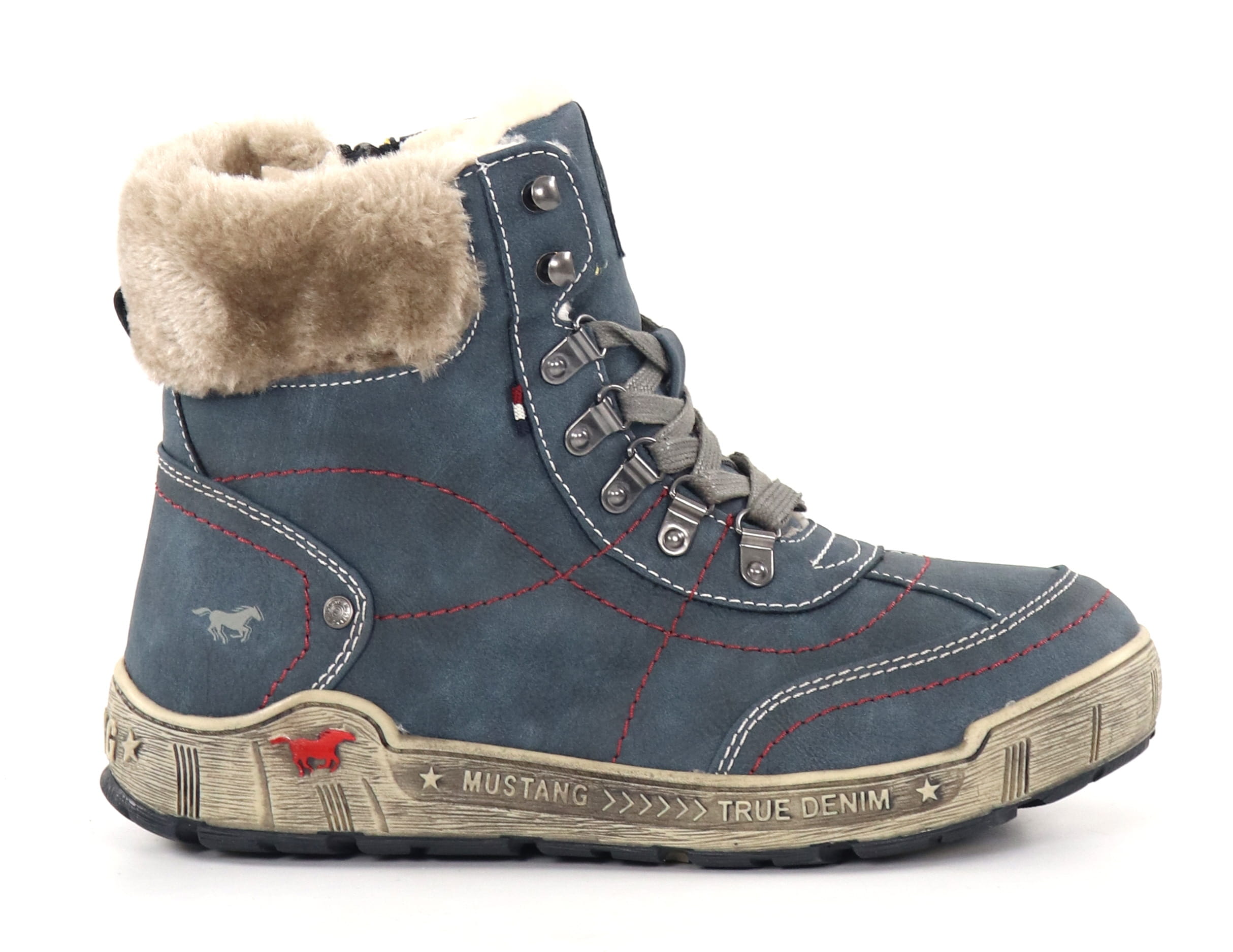 Denim blue ankle boots with a soft and warm teddy lining.