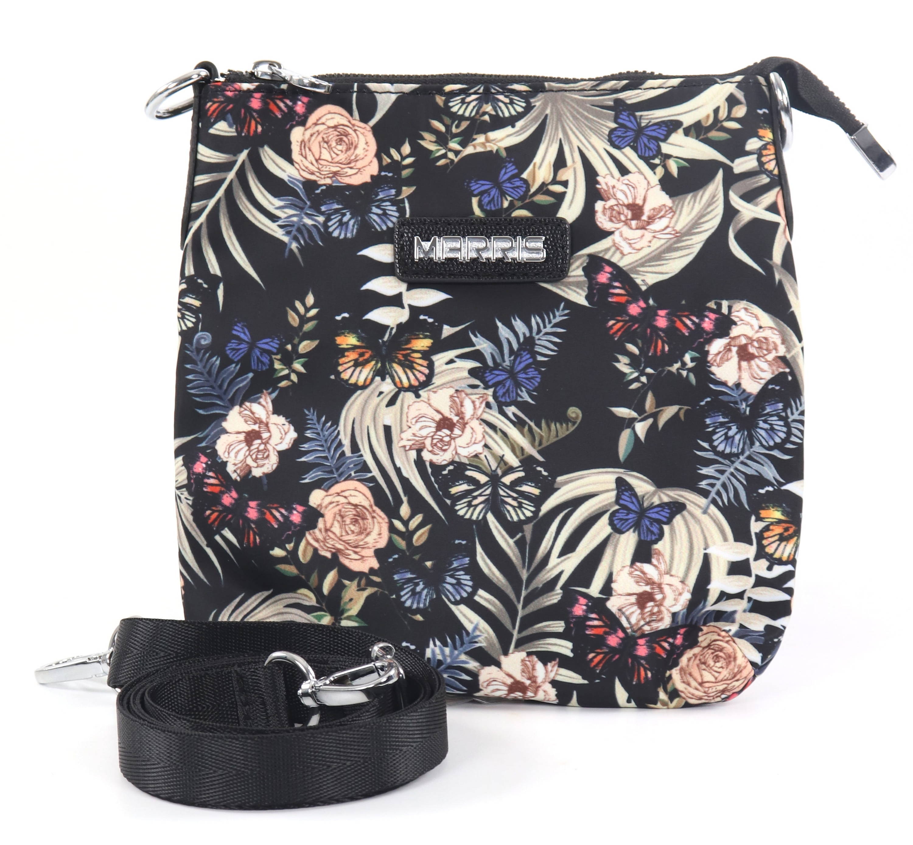 Fabric, flower-patterned small bag with adjustable shoulder strap.