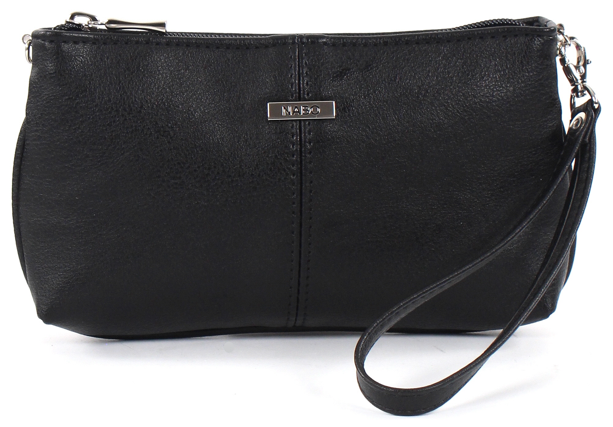 Evening bag made of artificial material, removable shoulder strap and wrist loop.