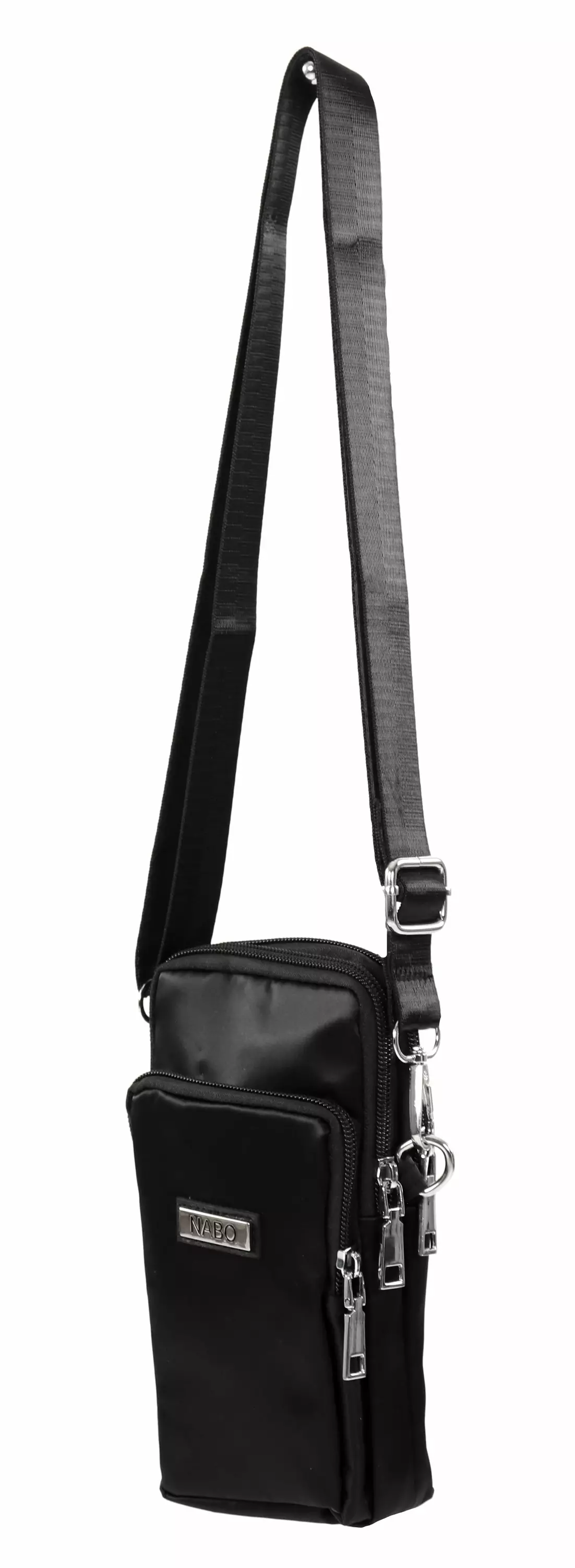 Black fabric phone case/small bag with adjustable shoulder strap.
