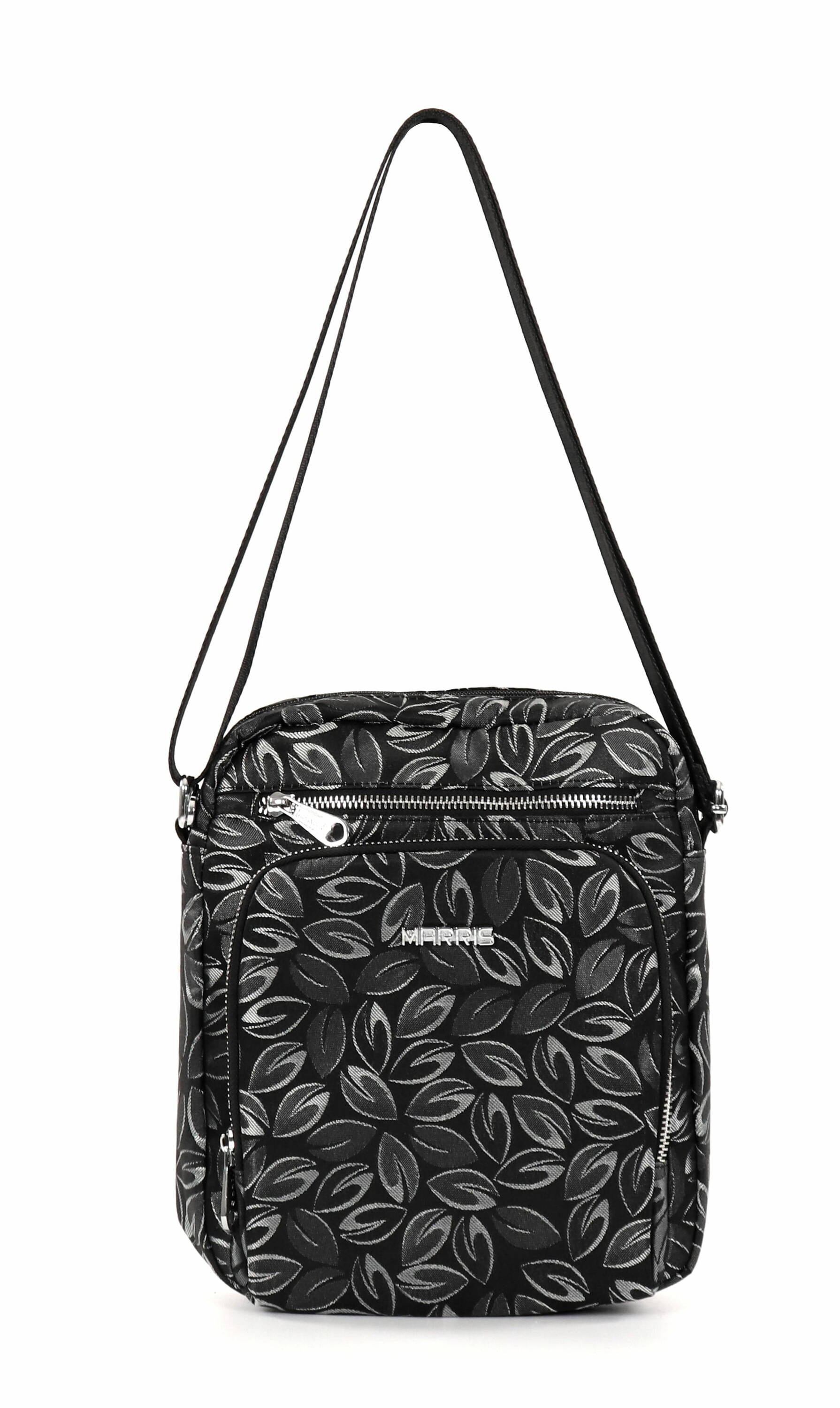 Fabric, patterned bag with adjustable shoulder strap.