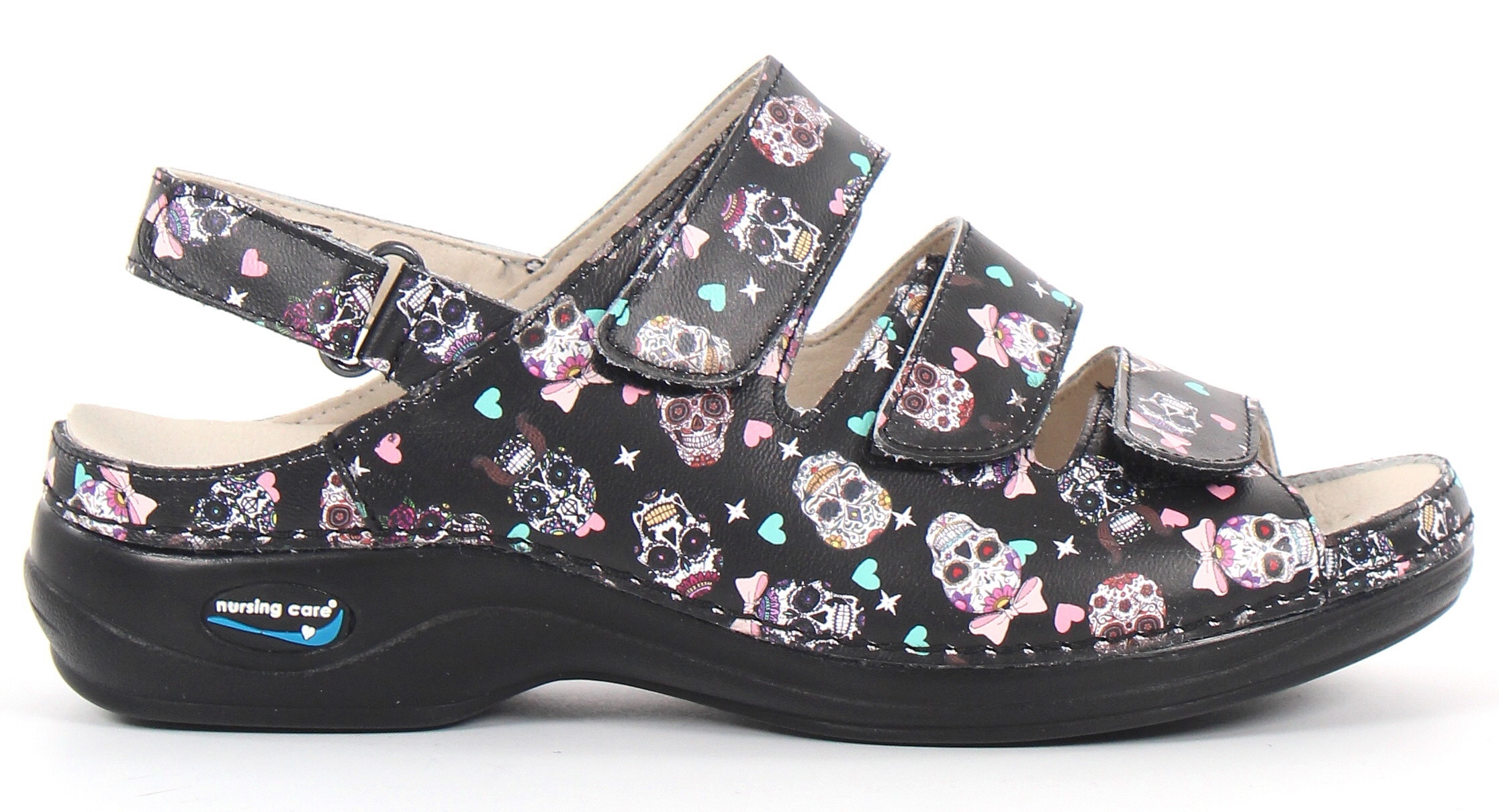 Work shoes have three adjustable straps on the top and an adjustable back strap. Heel height about 3 cm.