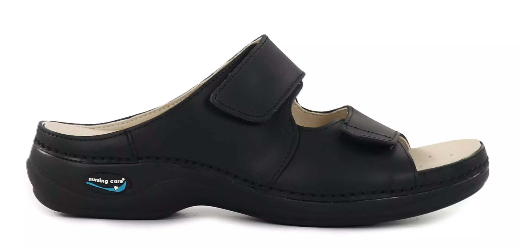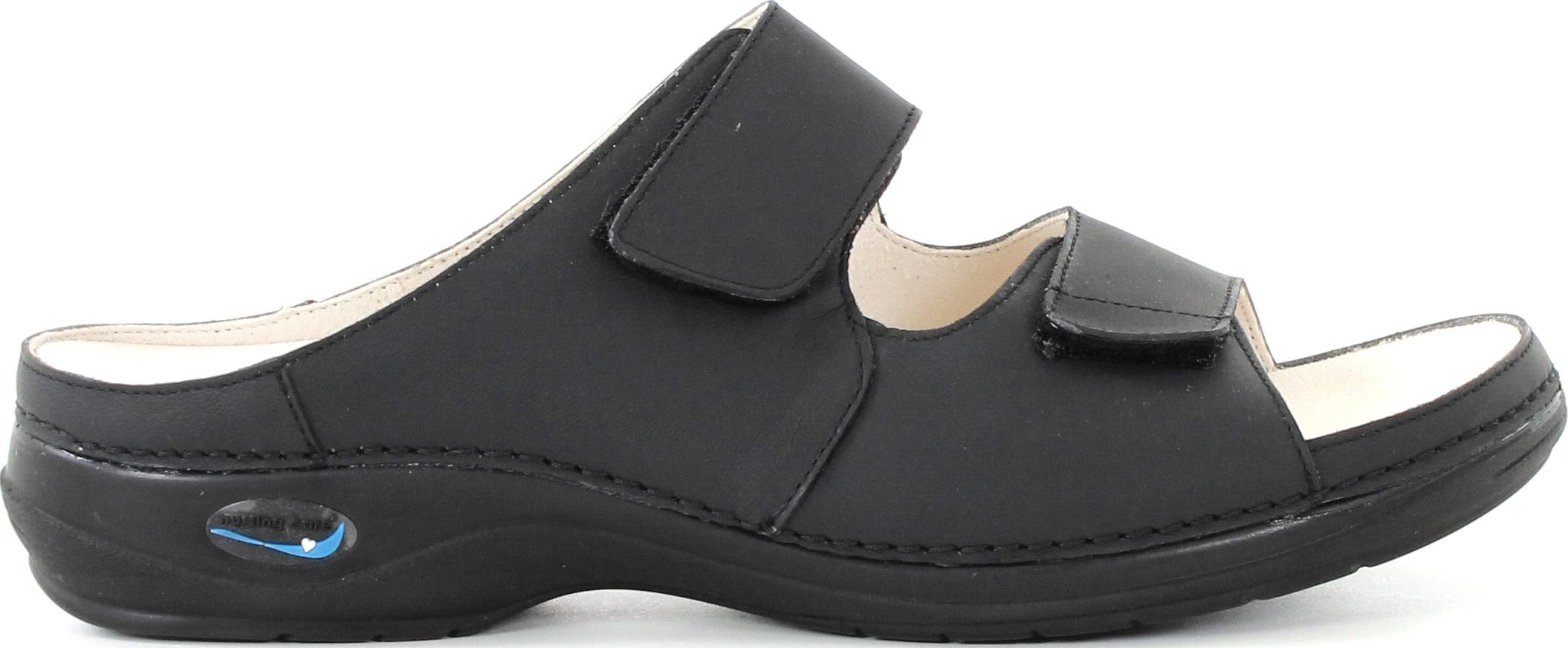 Nursing Care Machine washable sandals WG811 black WashGo machine washable work shoes in leather. Their anatomically designed insoles maintain an anatomically correct posture and has enough room for your toes - Removable insoles are soft with shock absorbing feature while lightening the steps, but are also supportive and stable. You can protect the leather with natural wax. Do not use liquid shoe polish. - WashGo shoes are anti-slip, anti-static, certified and CE-marked. - WashGo work shoes are machine washable at 30 degrees. Remove the insoles and put in the plactic shaper that was delivered with the shoes. Wash your shoes and insoles with dark clothing. Leather does not harden nor lose flexibility. They emit minimal colour during wash. Removable insoles in microfiber are very flexible, they do not harden. - No backstrap - Heel about 3cm NOTE!! Do not dispose the plastic shapers that were delivered with the shoes! They must always be put inside the shoes before washing! Let the shoes dry with out shapers.