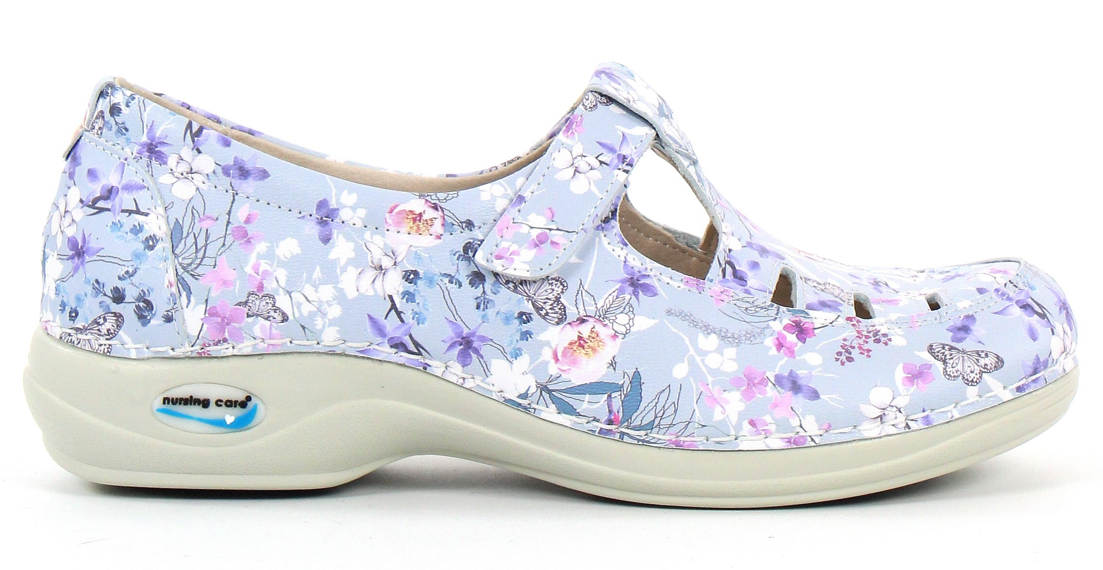 The work shoes have an adjustable velcro strap on the top. Elastic gussets on the both sides, at the back. Heel height about 3 cm.
